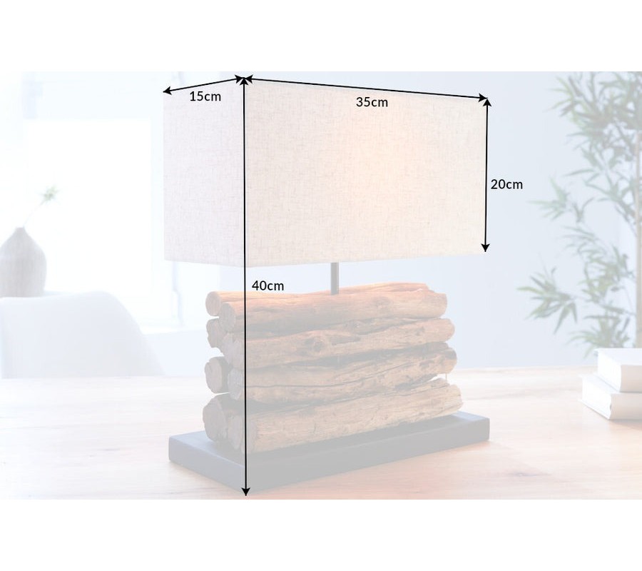 Štýlová stolná lampa v naturálnom spracovaní je vyrobená z masívneho dreva, ktoré je doplnené béžovým ľanovým tienidlom. Lampa je prispôsobená pre žiarovku s maximálnym výkonom 60W alebo E27. Rozmery: 35cm x 40cm x 15cm. Každý jeden kus lampy je unikátom pre svoje ručné spracovanie a pre aktuálne dispozície použitého dreva.