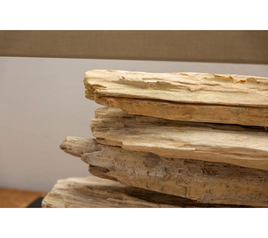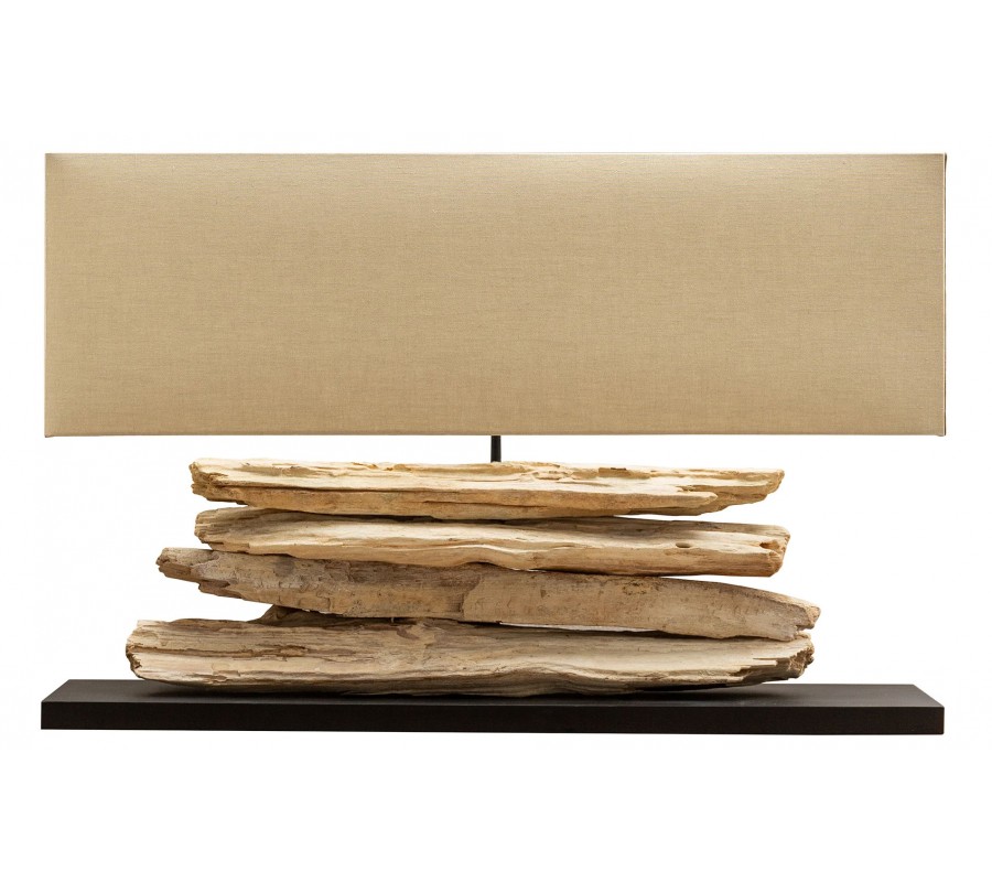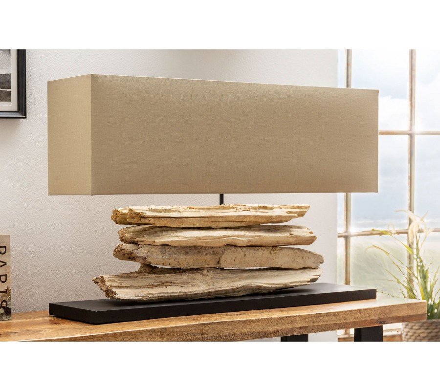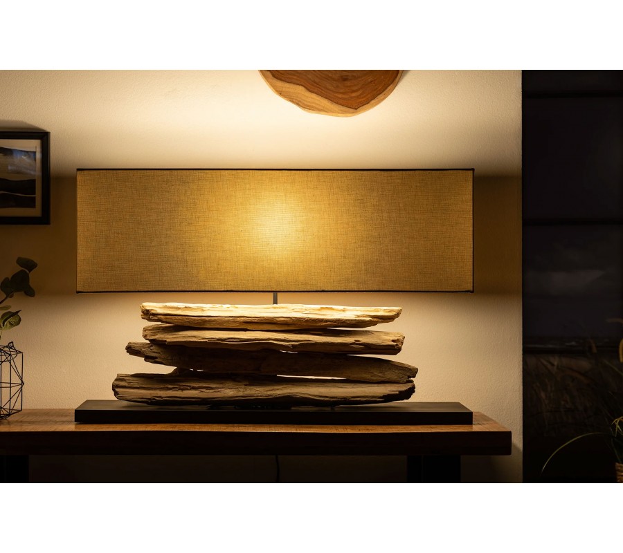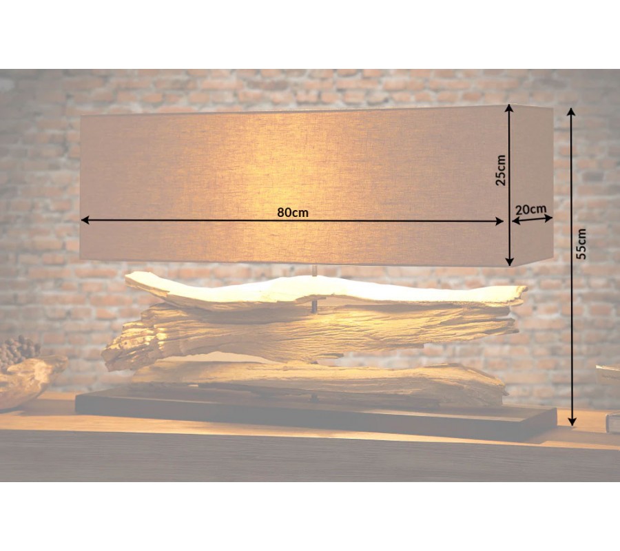 Jedinečná moderná lampa Riverine je krásnym doplnkom koloniálne ladených domácností, najmä pre umiestnenie na masívnu komodu. Mystický až okultný vzhľad lampy vnesie do interiéru neoceniteľný autentický nádych. Jedinečné proporcie práve použitého masívneho dreva robia z každej lampy unikát. Tienidlo je vyrobené zo ľanu. Rozmery: 80cm x 55cm x 20cm; tienidlo: 80cm x 20cm x 25cm. Lampa je prispôsobená pre žiarovku s maximálnym výkonom 60W alebo E27.