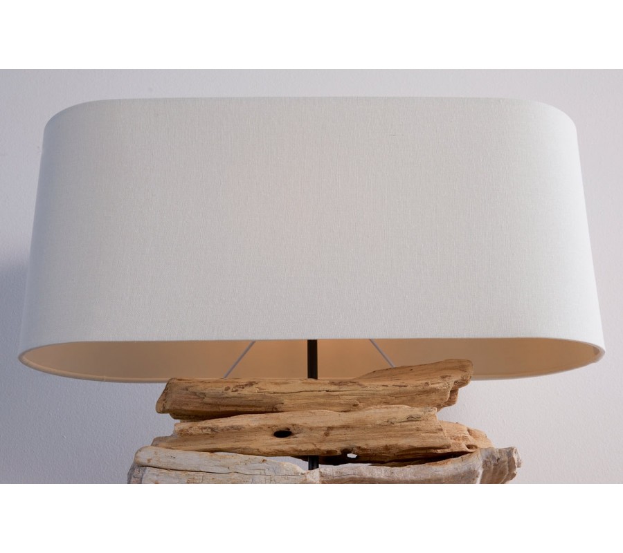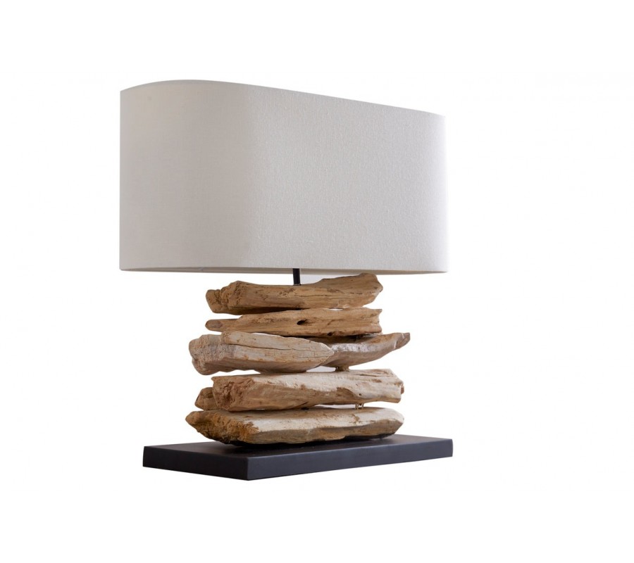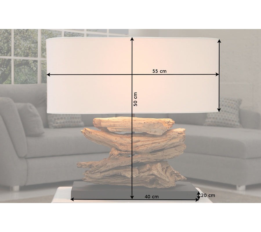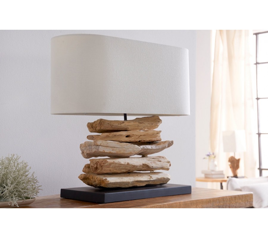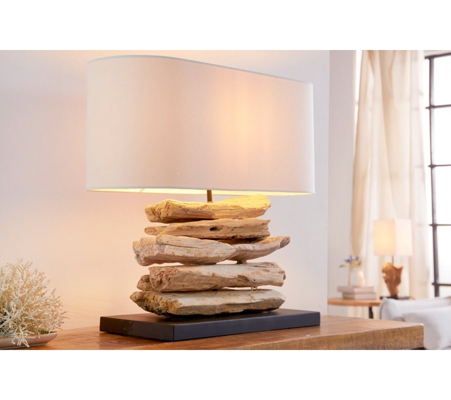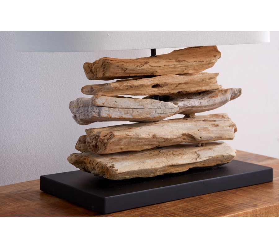 Stolná lampa Duna v etno štýle prináša do interiéru autentickú prírodnú atmosféru a zároveň originálny dizajnový prvok. Jej výrazná základňa je tvorená vrstvami hnedého masívneho naplaveného dreva, ktoré sú nepravidelne naskladané na seba a vytvárajú dojem organickej, ručne ukladanej štruktúry.