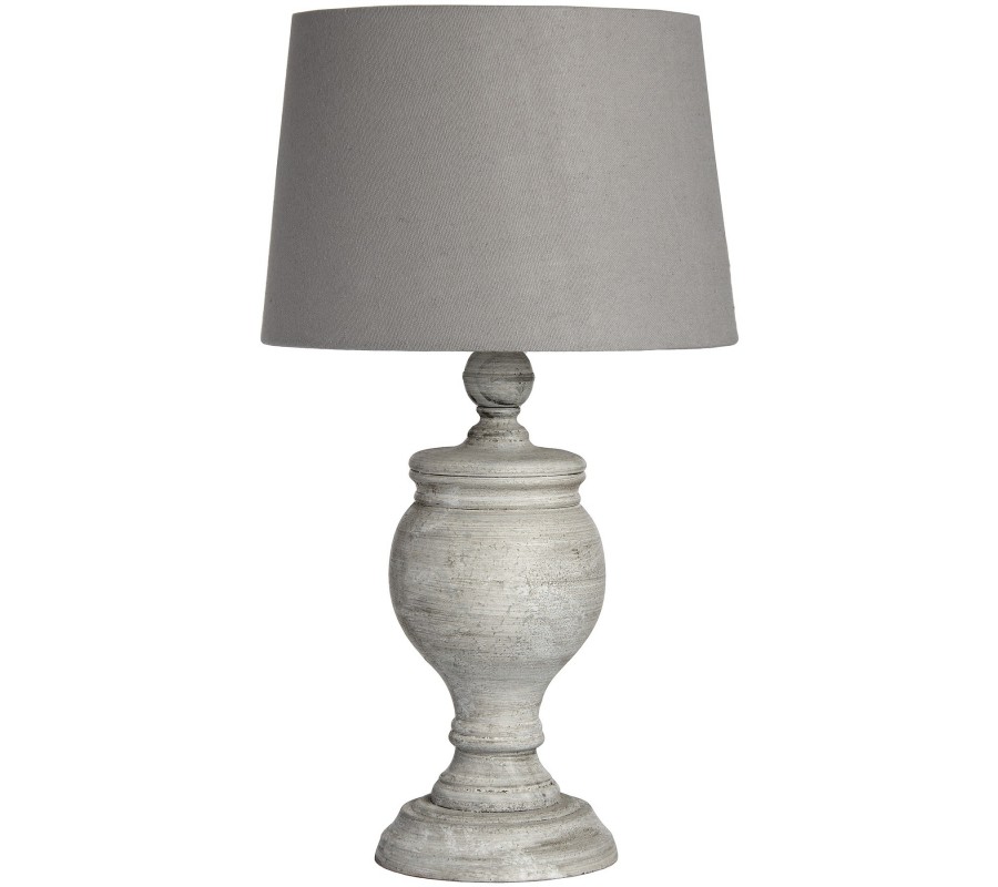 Vintage provensálska stolná lampa Uthina so sivou vyrezávanou podstavou s patinou a okrúhlym textilným tienidlom 53 cm