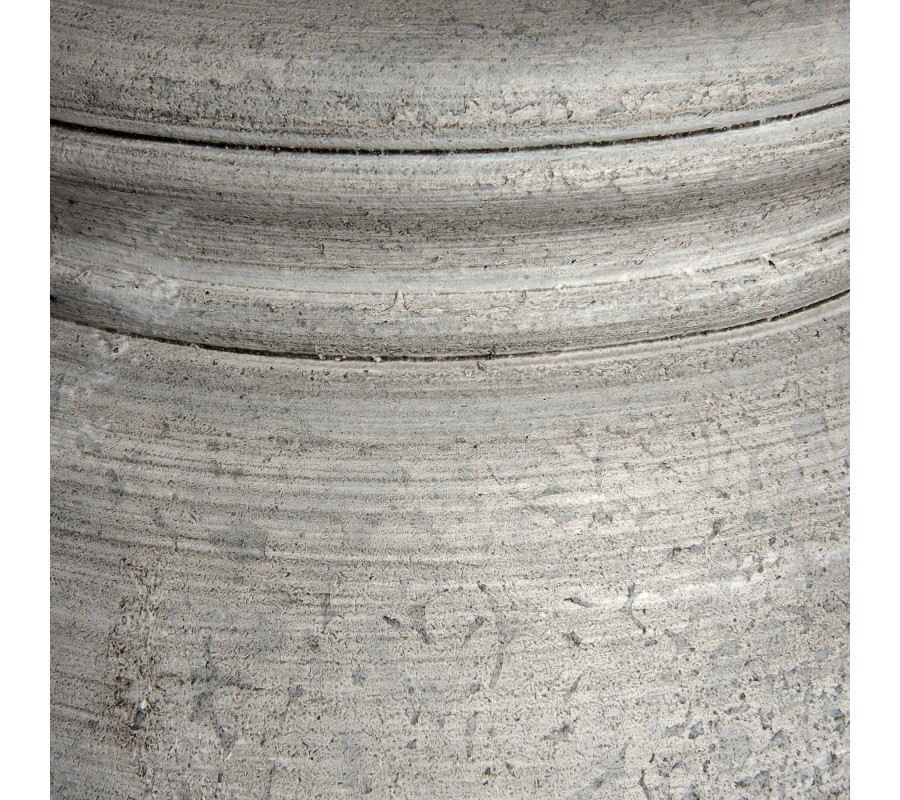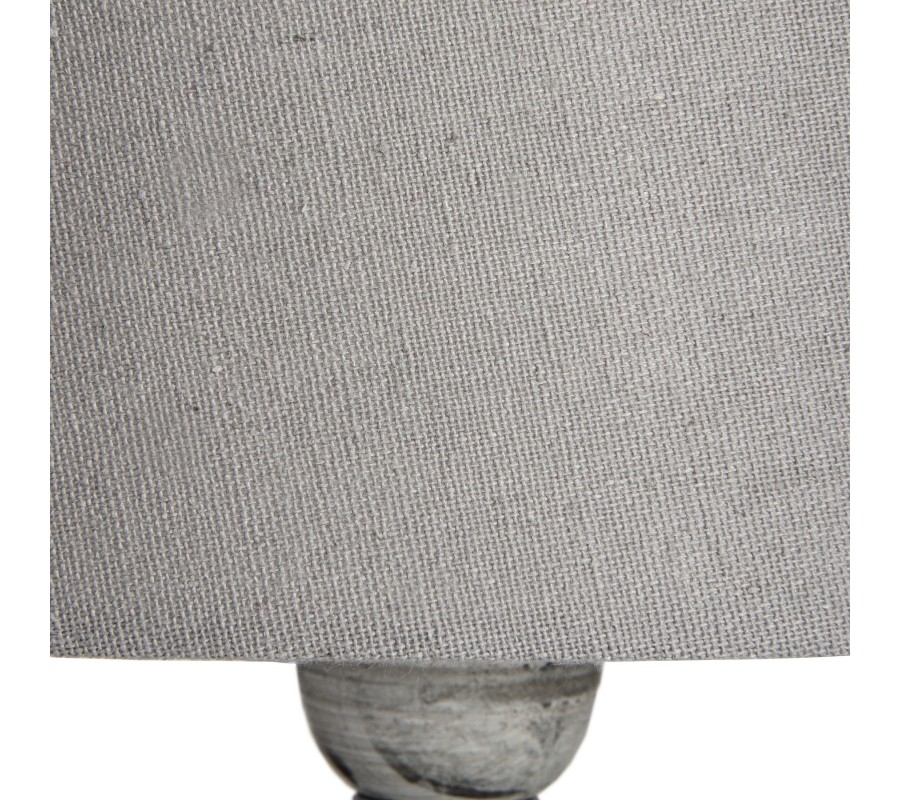 Podstava je vyrobená z umelej živice, ktorá umožňuje dizajn s dôkladne prepracovanými detailmi a zároveň vizuálne pripomína keramiku, ale je odolnejšia. Povrch je jemne pórovitý a svetlú sivú farbu strieda subtílna tmavšia patina, vytvárajúca originálny vintage vizuál. Tienidlo je vyrobené z textilu v svetlej sivej farbe.