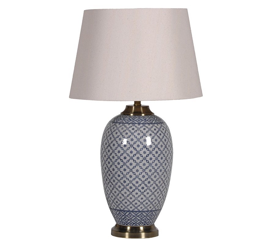 Dizajnová stolná lampa Alta je vyhotovená v nadčasovom a nestarnúcom štýle vintage, ktorý môžeme vidieť najmä na vkusných okružiach zlatej farby v hornej a dolnej časti porcelánového tela lampy. Porcelánové telo lampy je nosným prvkom jej dizajnového vzhľadu a jeho biele podfarbenie je dozdobené modrými ornamentami s jemným florálnym motívom uprostred každého štvorca tvoreného jemne zvlnenými líniami. V hornej časti je lampa doplnená o biele tienidlo so smotanovým nádychom, ktorého horná obruba sa jemne zužuje a dodáva mu mierne romantický nádych. V rámci vintage či koloniálnych obývačiek, hál či jedální odporúčame lampu Alta kombinovať najmä s masívnym nábytkom vo vintage či koloniálnom, prípadne i rustikálnom štýle a so zlatými rámami na zrkadlách či olejomaľbách.