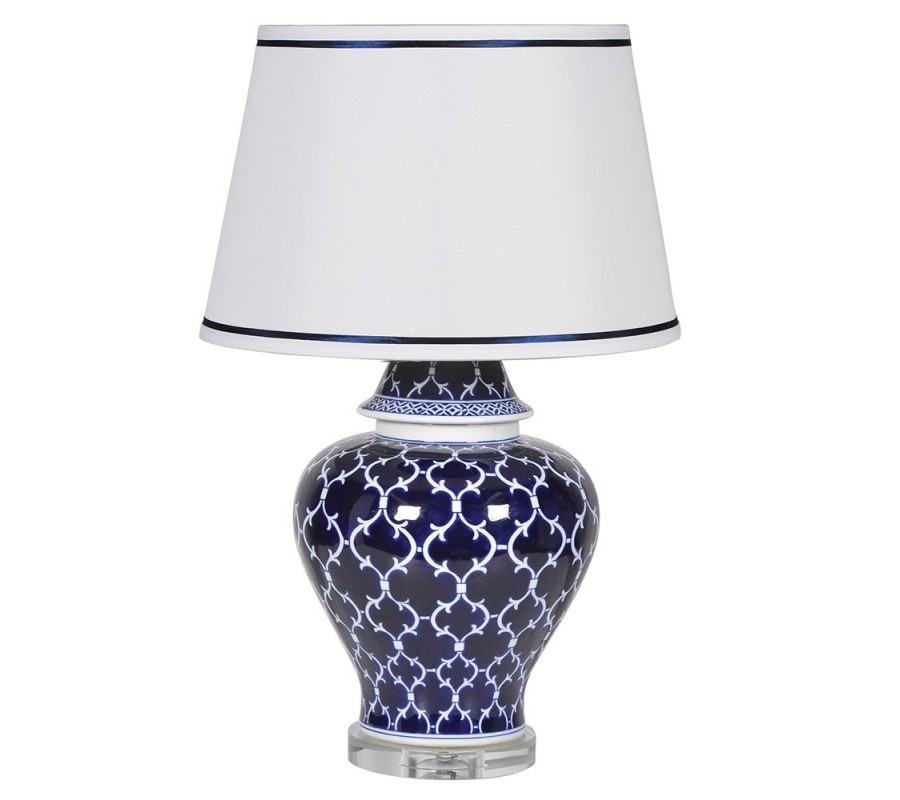 Vintage keramická modro-biela stolná lampa Eileen s jemnou ornamentálnou kresbou a podstavou z krištálu 66cm