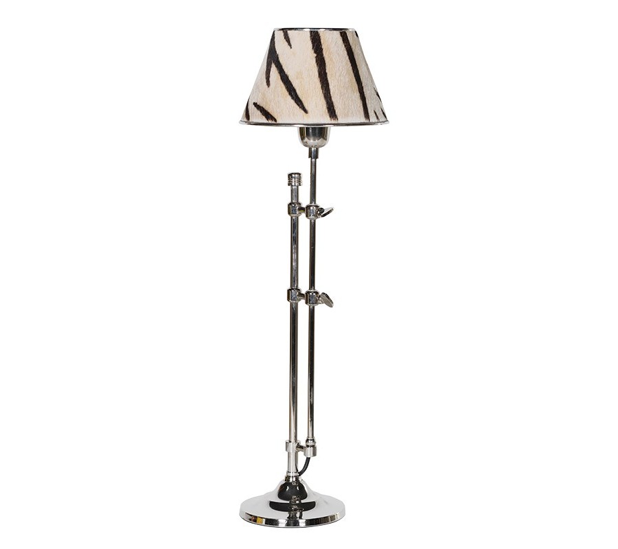 Stolná lampa Marty v štýle art deco s kovovou lesklou striebornou konštrukciou a koženým tienidlom so vzorom zebry 68cm