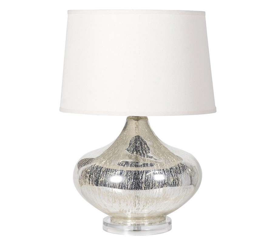 Glamour strieborná okrúhla stolná lampa Perry s bielym valcovým tienidlom a sklenenou nohou 60 cm