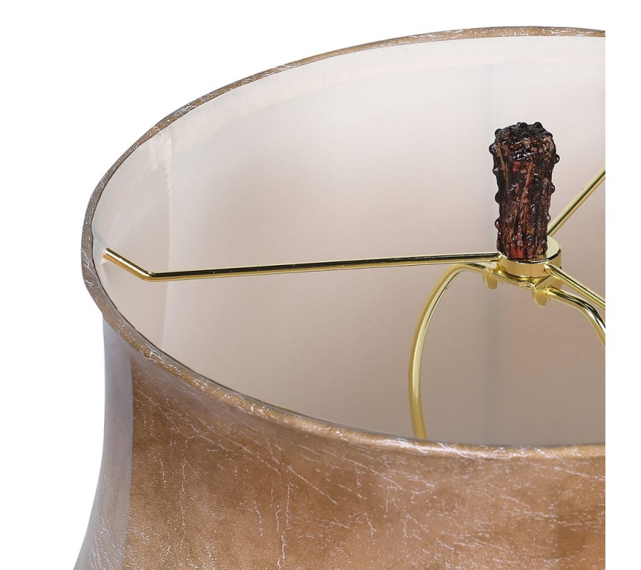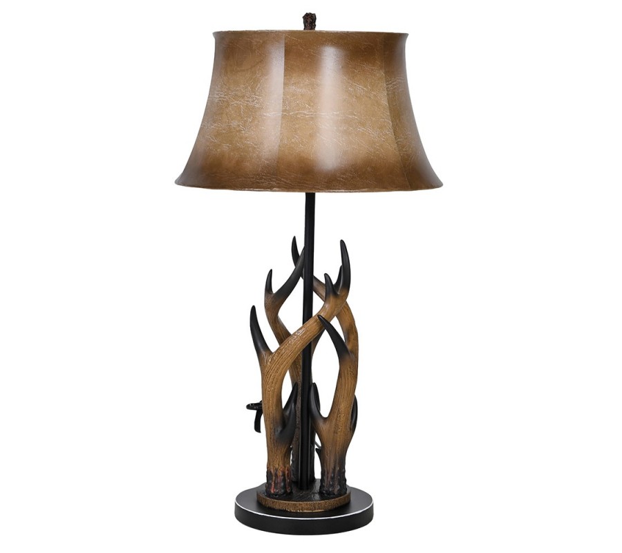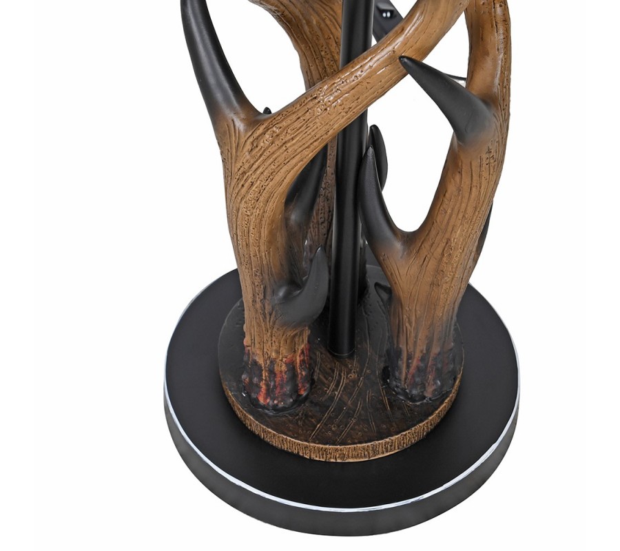 Lampa má tenkú valcovitú nohu s nízkou okrúhlou podstavou v čiernej farbe z kovu. V jej spodnej časti je upevnený dekor z umelej živice v podobe troch parohov. Dôkladne prepracované detaily a prírodné svetlé a tmavšie hnedé odtiene im dodávajú realistický vizuál, ktorý upúta na prvý pohľad.