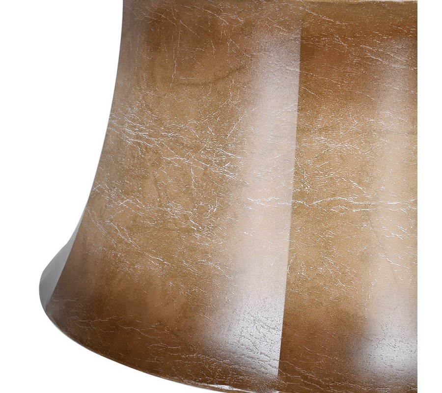 Vo vrchnej časti sa nachádza tienidlo s dizajnom kože v koňakových hnedých tónoch. Vrchný a spodný okraj je tmavší a farba postupne prechádza v gradientovom efekte do svetlejšej strednej časti, čo zabezpečuje kvalitné osvetlenie. Tienidlo má klasický vintage tvar, s mierne rozšíreným a vyhnutým vrchným a spodným okrajom. Po obvode ho tiež zdobia vertikálne zalomenia, ktoré vytvárajú panelový efekt. Konštrukcia tienidla má lesklú zlatú farbu a prináša do dizajnu dotyk luxusu.