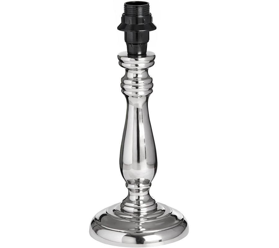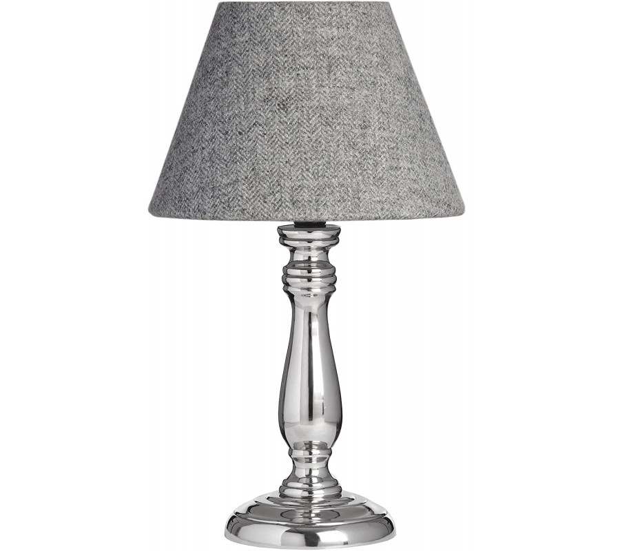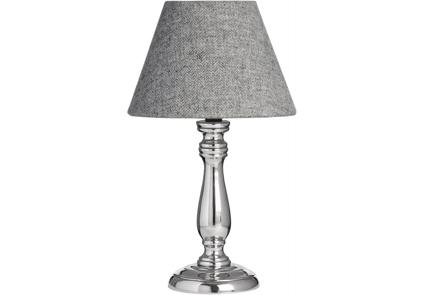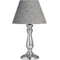 Malá rustikálna chrómová stolná lampa disponujúca striebornou rustikálne zdobenou podstavou v kombimácii so šedobielym tienidlom. Vhodná je do stolíkov v priestoroch dizajnovaných v neutrálnych tmavých odtienoch, kde svojim leskom chrómovej nožicky príjemne doplní atmosféru.