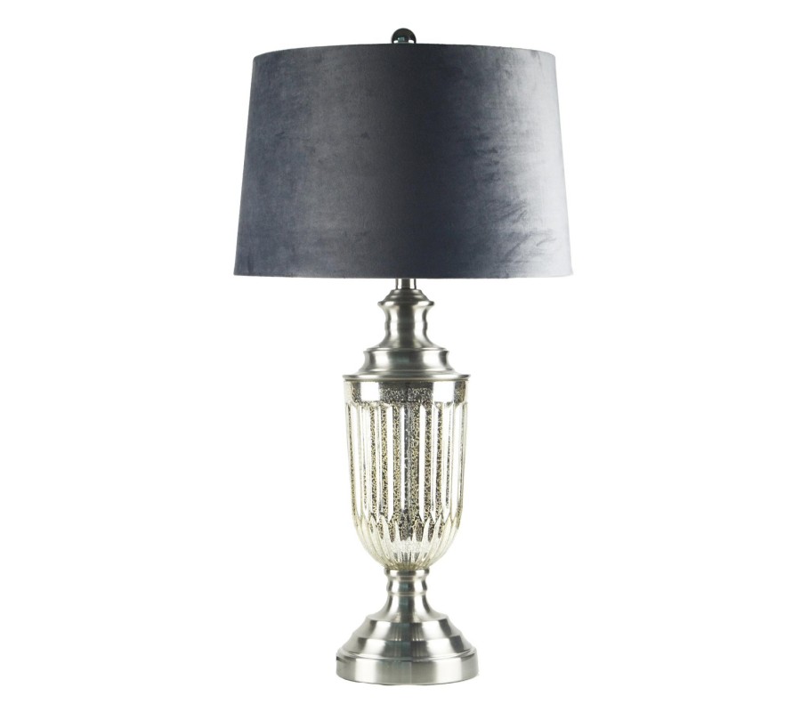 Krásna ozdobná lampa s nohou v tvare vázy so strieborným nádychom a tmavým zamatovým tienidlom je ideálnym doplnkom každého interiéru.