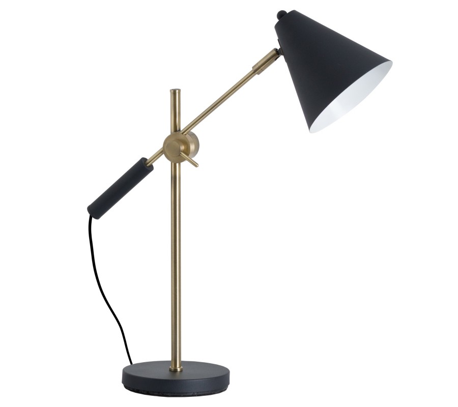 Dizajnová stolná lampa v nadčasovej farebnej kombinácii čiernej a zlatej sa svojim vzhľadom hodí najmä do moderne a industriálne zariadených priestorov. Praktickým doplnkom je možnosť výškového prispôsobenia tienidla, čo oceníte najmä pri práci. Materiál: kov
