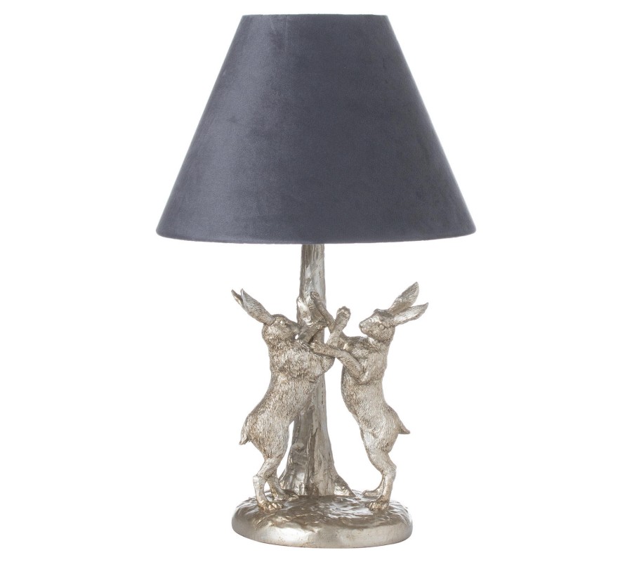 Štýlová stolná lampa Pochodujúce Zajace v striebornej farbe so sivým tienidlom 48cm
