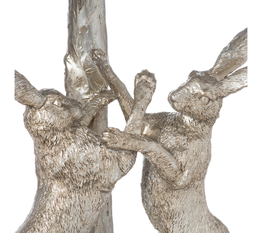 Krásna lampa z kolekcie art-deco lámp so zvieracím motívom v podobe dvoj pochodujúcich zajačikov sa vám určite zapáči. Stolná lampa má primárne dizajnový účel, kde jej kostra s tienidlom predstavujú strom s konármi pod ktorými sa veselo hrajú dve strieborné figúrky zajačikov ušiačikov. Celkové keramické prevedenie lampy je precízne vyrezávané, či už sú to zajačiky alebo samotná lampa v striebornej farbe. Zakončenie lampy v podobe sivého tienidla podčiarkuje neutrálny vzhľad, ktorý sa vynikajúco kombinuje so strieborným alebo zrkadlovým nábytkom v art-deco štýle, čo vytvorí dizajnový až umelecký pocit z vášho interiéru vďaka štýlovej stolnej lampe Pochodujúcich Zajacov.