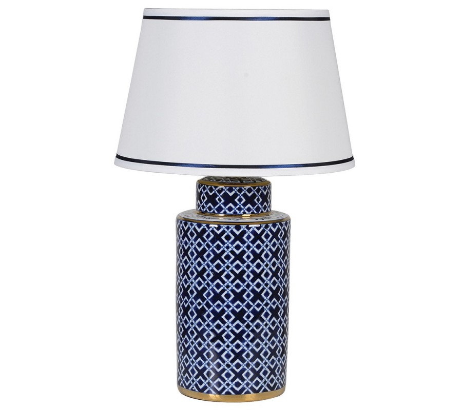 Art-deco porcelánová modrá stolná lampa Laponda s bielou geometrickou kresbou a bielym tienidlom 70cm