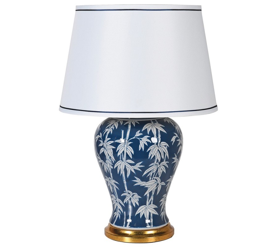 Vintage porcelánová modro-biela stolná lampa Genovia s kresbou bambusu a podstavou zlatej farby 66cm