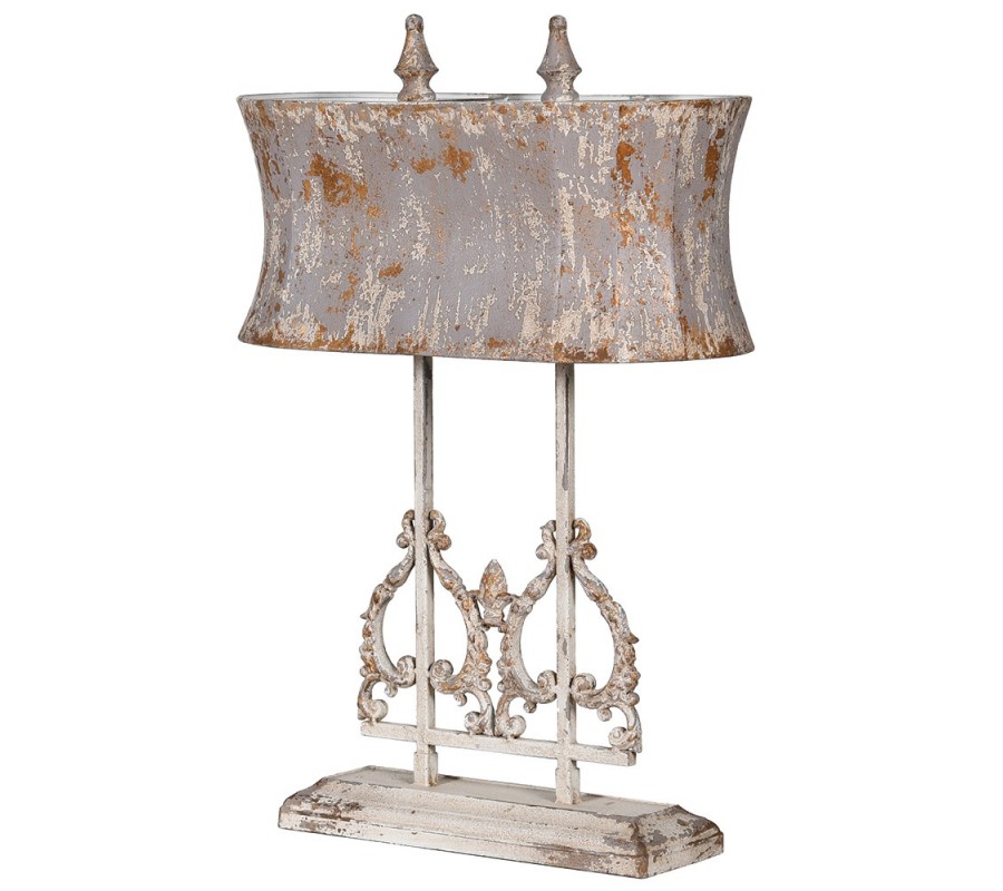 Vintage ornamentálna sivá a slonovinová kovová oválna stolná lampa Silvertongue s umelou patinou a detailami medenej farby 74cm