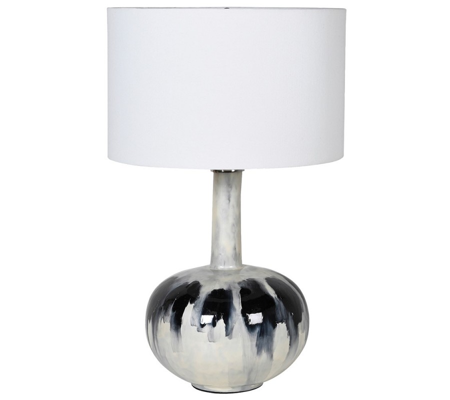Nadčasová lampa Jaquen je vyrobená s dôrazom na vintage prevdenie a disponuje miernym moderným nádychom predovšetkým vďaka svojej výzdobe a novodobému tvaru tela. Čiernoiele sklenené telo lampy má autentický tvar a je vo svojej dolnej časti zdobené škvrnami tvorenými tmavou glazúrou. Tienidlo lampy Jaaquen je romantickej snehobielej farby a dovoľuje vyniknúť predovšetkým dizajnovému telu. Telo lampy je dizanovo tvorené oblou a širokou dolnou časťou, na ktorú je nasadené úzke hrdlo rovnomerného priemeru, pripomínajúce úzku sviecu. Glazovaná úprava tela pripomína typické islandské zdobenia inšpirované tamojšími geódami. Lampu Jaaquen vo vintage štýle odporúčame ladiť predovšetkým do inteiérov v danom štýle, či v moderne ladených obývačkách, predsieňach či hosťovských izbách. Lampu Jaquen odporúčame kombinovať najmä s doplnkami v odtieňoch sivej a chladných farieb či s obrazmi s danou farebnou škálou v strieborných rámoch, ktoré sa krásne vizuálne naviažu na vnútornú striebornú časť lampy.