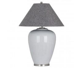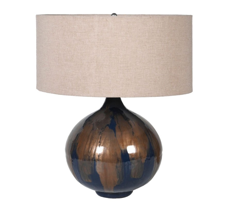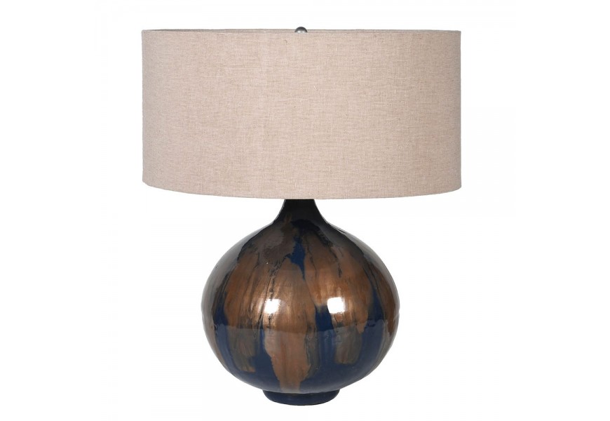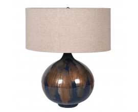 Luxusná lampa Margaery stelesňuje šarm a pôvab vo vkusnom tele v neutrálnych odtieňoch hnedej, béžovej s jemným akcentom čiernej farby. Mohutné a stabilne pôsobiace sklenené telo disponuje povrchovým smaltovaním atramentovej modrej a arašidovej farby pripomúnajúcim hnedý vzácny kameň a je kombinované s prirodzene matným, rovomerne širokým, tienidlom z ľanu v nežnom ustricovom odtieni béžovej farby. Sklenené telo lampy Margaery je v hornej i dolnej časti zúžené, pričom v hornej časti sa naťahuje do úzkeho krátkeho hrdla, čo zvyšuje luxusný vzhľad a dodáva mu skutočne exkluzívny vintage nádych. V rámci koloniálne a vintage ladených dámskych klubov, obývačiek, hál či kancelárií odporúčame lampu Margaery kombinovať s masívnym nábytkom s jemnými kovovými akcentami a neutrálnymi farebnými tónmi.