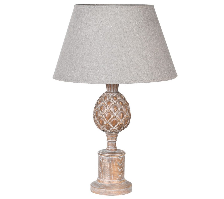 Štýlová vintage lampa Pemi je unikátny kúsok s dizajnovou nohou do spálne či obývačky. Noha lampy je vyrobená z kombinácie masívneho dreva a živice s povrchovou úpravou opotrebenia, ktoré sa docieli nanesením svetlej farby na podkladovú bázu. Farba sa zapracuje do škár, následne sa zotrie a zanechá výsledný požadovaný efekt čo je typické pre nábytok vo vintage štýle. Noha má hladký matný zdobený povrch s ručným vyrezávaním. Pri tienidle vyrezávanie pripomína tvar ananásu s valcovou podstavou s detailmi, ktoré majú oblé hrany.