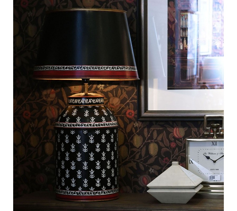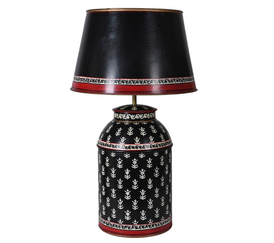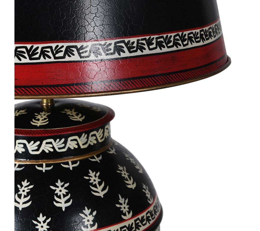 Vintage stolná lampa Raven pripomína dizajn starožitných plechoviek na čaj. Jej podstavec je vyrobený z kovu s čiernym matným povrchom, ktorý je zdobený kontrastnými kvetinovými vzormi v bielej farbe. Červené a zlaté lemovanie dodáva lampe elegantný akcent.