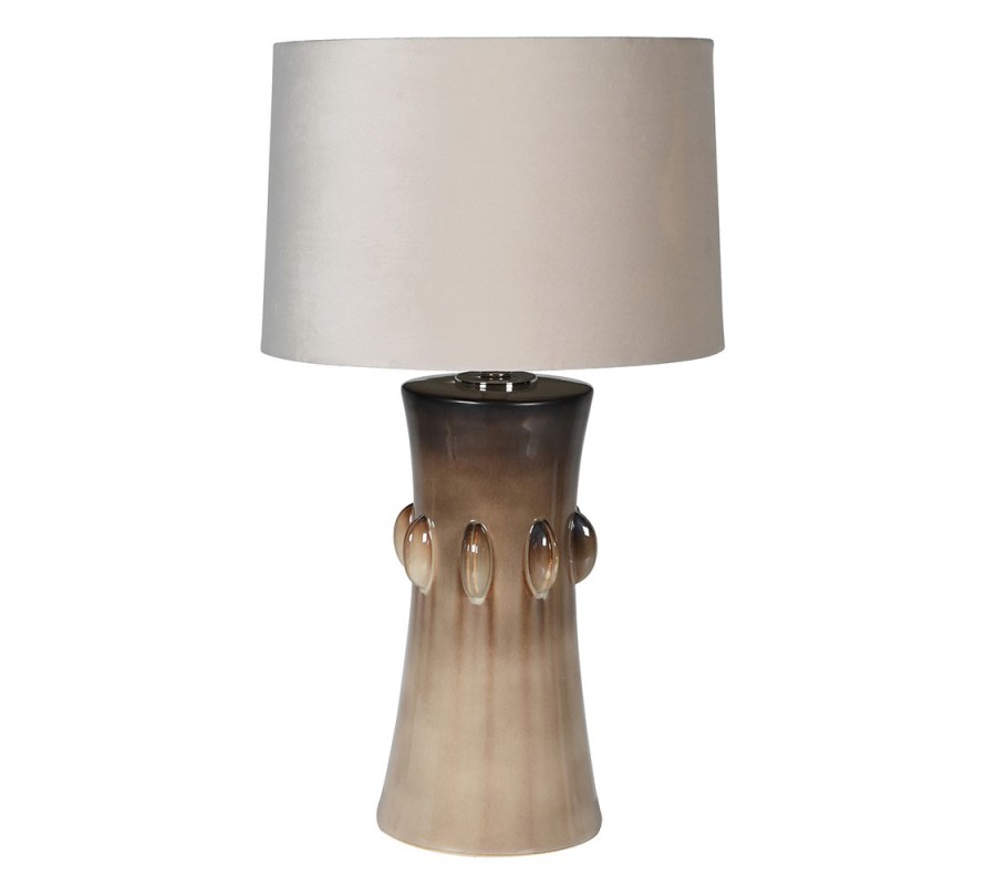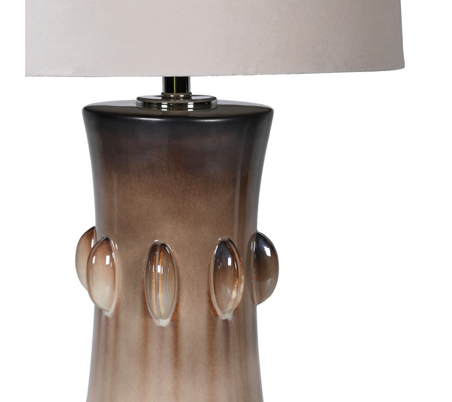 Lampe dominuje keramická podstava, ktorá má valcovitý tvar, zúžený v strede do elegantnej krivky. V najužšom bode sa nachádza pás reliéfnych poloblúkových ozdôb, symetricky umiestnených po obvode. Podstava má v spodnej časti svetlú béžovú farbu, ktorá v plynulom gradiente prechádza až do tmavej hnedej farby vo vrchnej časti a vizuálne tak oddeľuje tienidlo od spodnej časti.