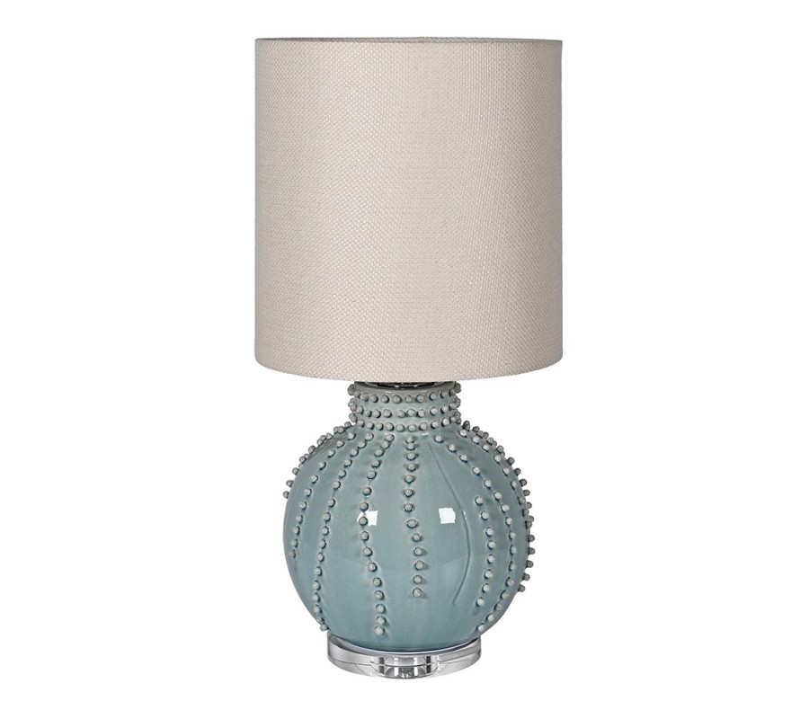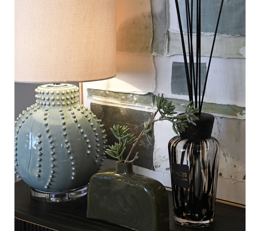 Keramickú podstavu pokrýva lesklý náter v svetlej pastelovej zelenej farbe. Výborne ju dopĺňa svetlý odtieň tienidla a spoločne tak tvoria elegantnú a sofistikovanú farebnú paletu. Tienidlo má jednoduchý valcovitý tvar a jeho hladké steny nechávajú vyniknúť dizajn podstavy. Je vyrobené z ľanu v naturálnom svetlom bielom odtieni s nádychom béžovej.