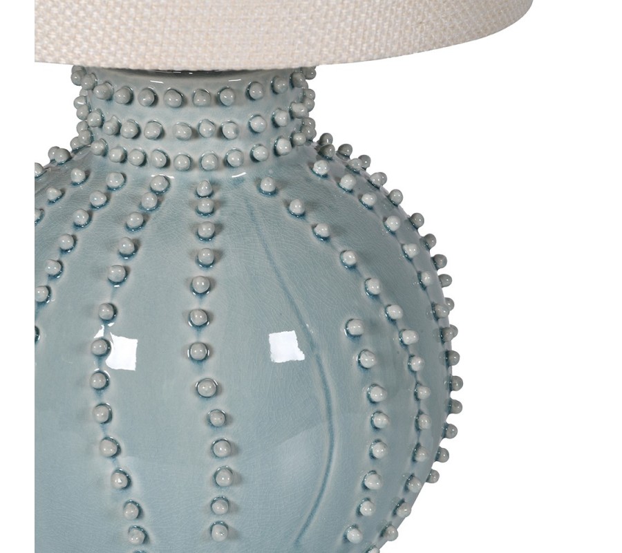 Dizajnová keramická stolná lampa Nori s pastelovou zelenou podstavou s reliéfnym korálkovým zdobením a bielym tienidlom 73 cm