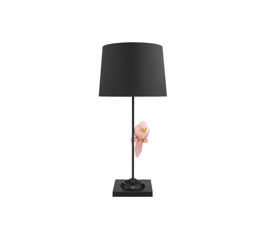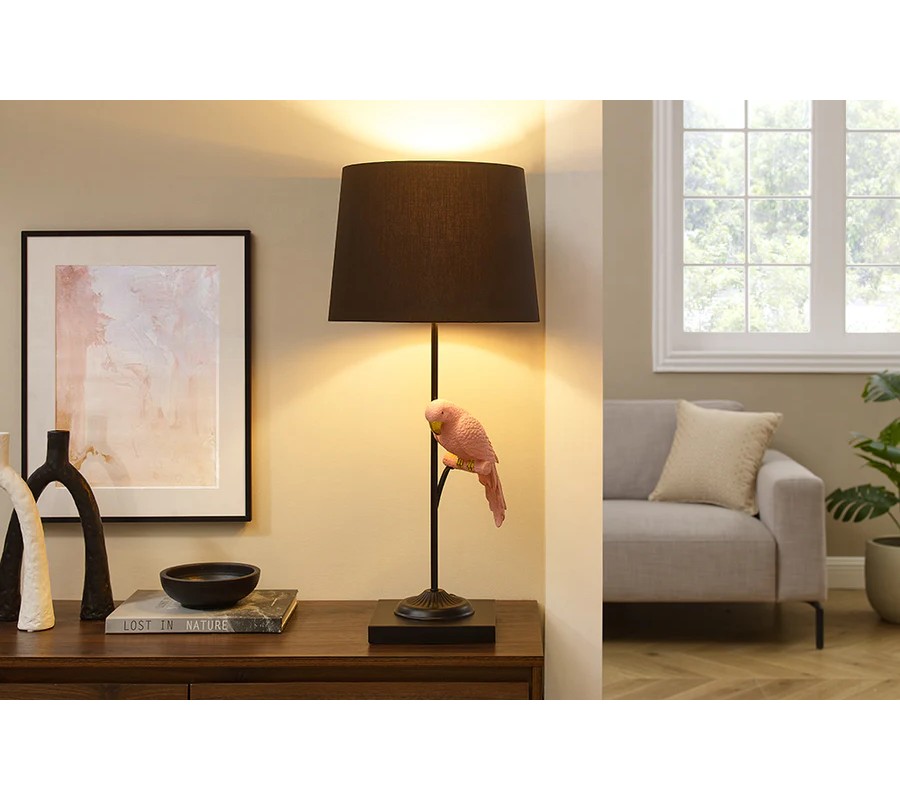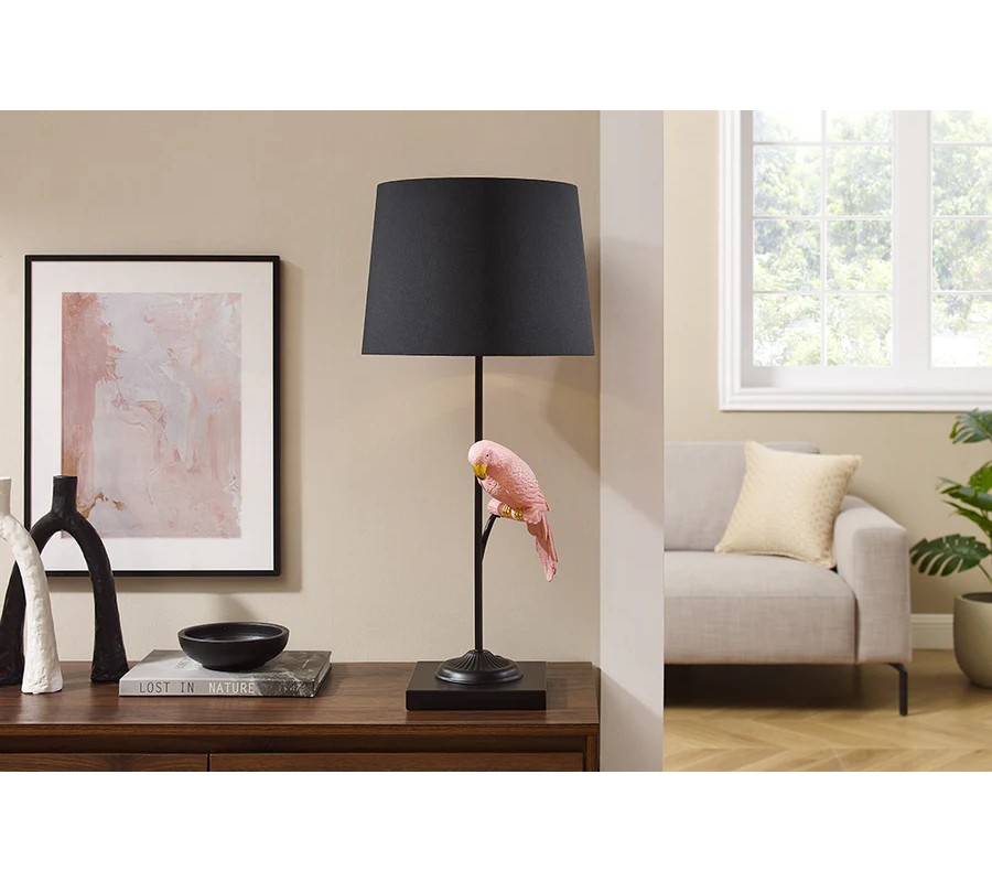 Lampa je vhodná do interiérov zariadených v modernom, eklektickom alebo glamour štýle, kde vyniknú jej zaujímavé detaily a kontrast medzi čiernym tienidlom a ružovým papagájom. Skvelo sa hodí na nočný stolík, pracovný stôl alebo do obývačky ako doplnok, ktorý zaujme na prvý pohľad. Kombinovať ju môžete s nábytkom v neutrálnych odtieňoch, dekoráciami so zlatými prvkami alebo s prírodnými materiálmi, ako sú drevo či textílie, pre harmonický celok.