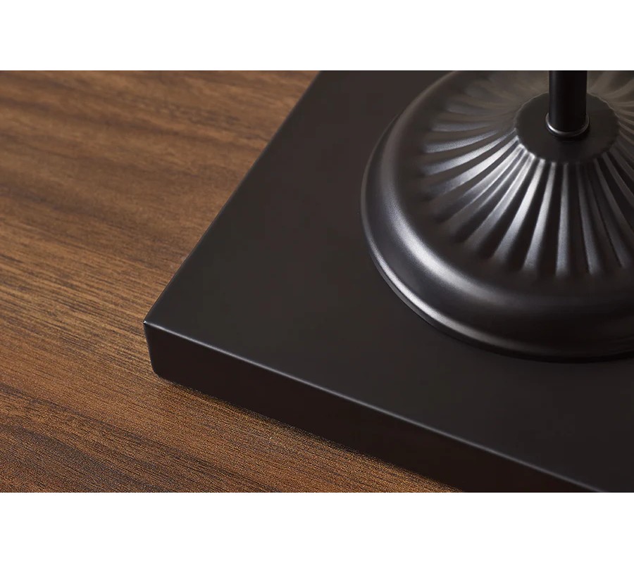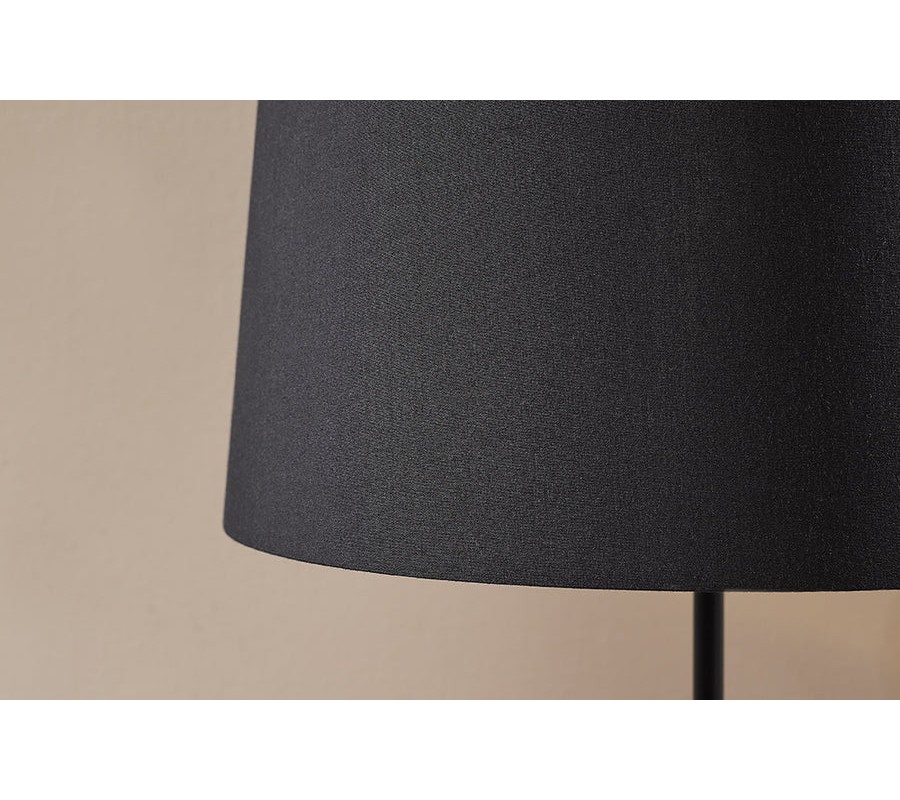 Stolná lampa s elegantným tienidlom v čiernej farbe vyrobeným z bavlny. Tienidlo má klasický kužeľovitý tvar, ktorý rovnomerne rozptyľuje svetlo a dodáva lampe príjemnú atmosféru. Tyč a podstava sú vyrobené z kovu v matnom čiernom prevedení, pričom podstava má jednoduchý obdĺžnikový tvar, ktorý zaručuje stabilitu.