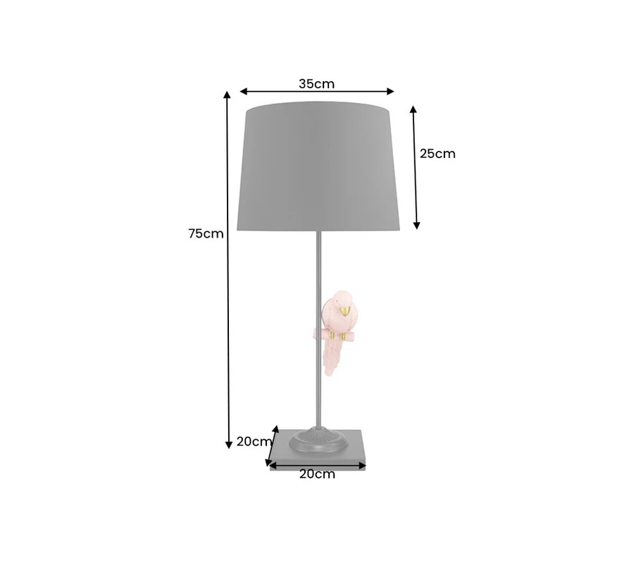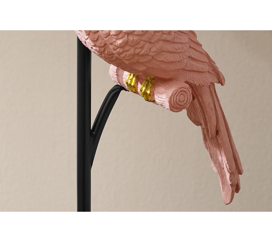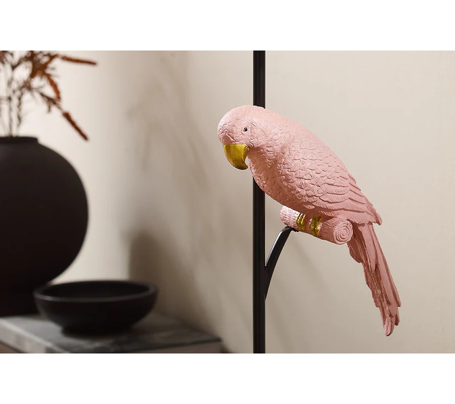 Zaujímavým detailom je dekoratívny papagáj zo živice v jemnom ružovom odtieni s pozlátenými akcentmi na nohách a zobáku, ktorý sedí na kovovej tyči a dodáva lampe hravý a originálny vzhľad.