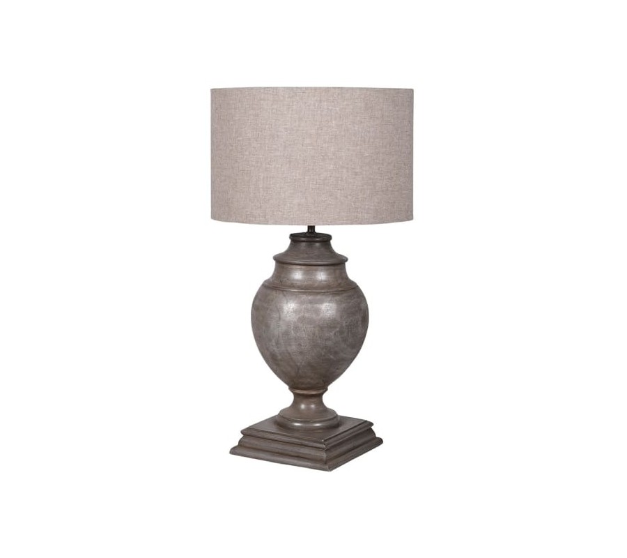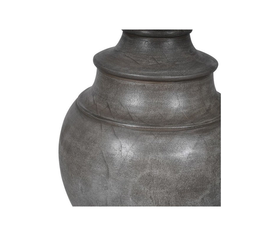 Stolná lampa Uran sa vyznačuje elegantným tvarom urny, ktorý dodáva jej dizajnu nadčasovú klasiku a sofistikovaný vzhľad. Noha lampy je vyrobená z mangového dreva, ktoré je známe svojou pevnosťou a jedinečnou štruktúrou. Povrch je upravený do jemného sivého odtieňa s patinou, ktorá zvýrazňuje prirodzenú textúru dreva a pridáva lampe rustikálny a vintage charakter. Podstava je štvorcová, s jemným stupňovaním a vyrezávanými detailmi, ktoré dodávajú stabilitu a vizuálnu zaujímavosť.