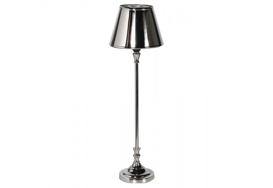 Tienidlo lampy má klasický kužeľovitý tvar, je vyrobené z kovu a má lesklý povrch v rovnakej chrómovej farbe ako noha. Tento jednotný farebný a materiálový dizajn vytvára harmonický a sofistikovaný celok.