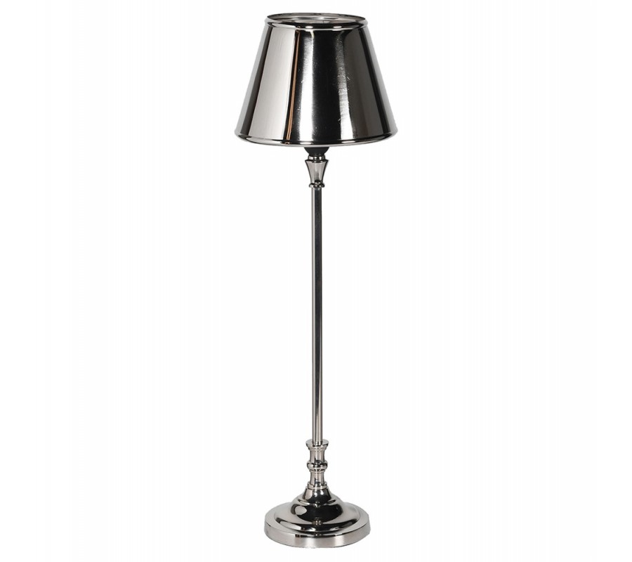 Vysoká stolná lampa Iris je vyrobená z kovu a kombinuje moderný glamour s industriálnym štýlom. Noha lampy je štíhla a hladká, zakončená jemnými ozdobnými detailmi, ktoré pripomínajú klasický dizajn. Povrch nohy je lesklý, v chrómovej farbe, čo jej dodáva elegantný a luxusný vzhľad. Podstava lampy je kruhová, mierne vyvýšená, so zaoblenými okrajmi, ktoré prispievajú k stabilite a celkovému estetickému dojmu.