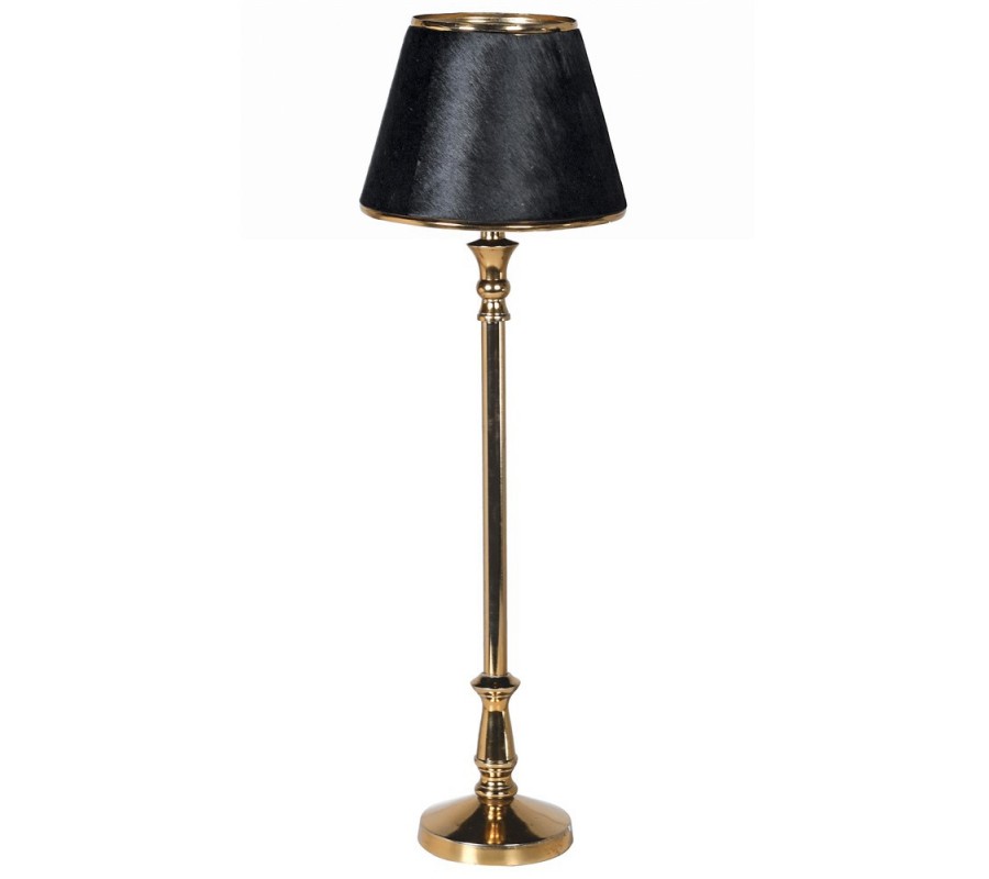 Tienidlo má klasický kužeľovitý tvar a na svojom povrchu obsahuje pravú kožu s vysokým vlasom v čiernej farbe, čo pridáva textúru a zaujímavý vizuálny efekt. Okraje tienidla sú lemované zlatými prvkami, ktoré elegantne prepájajú tienidlo s kovovou nohou. Štýl lampy spája moderný glamour s nádychom art deco, čo ju robí ideálnou pre interiéry, ktoré hľadajú výrazný a sofistikovaný dizajnový prvok.