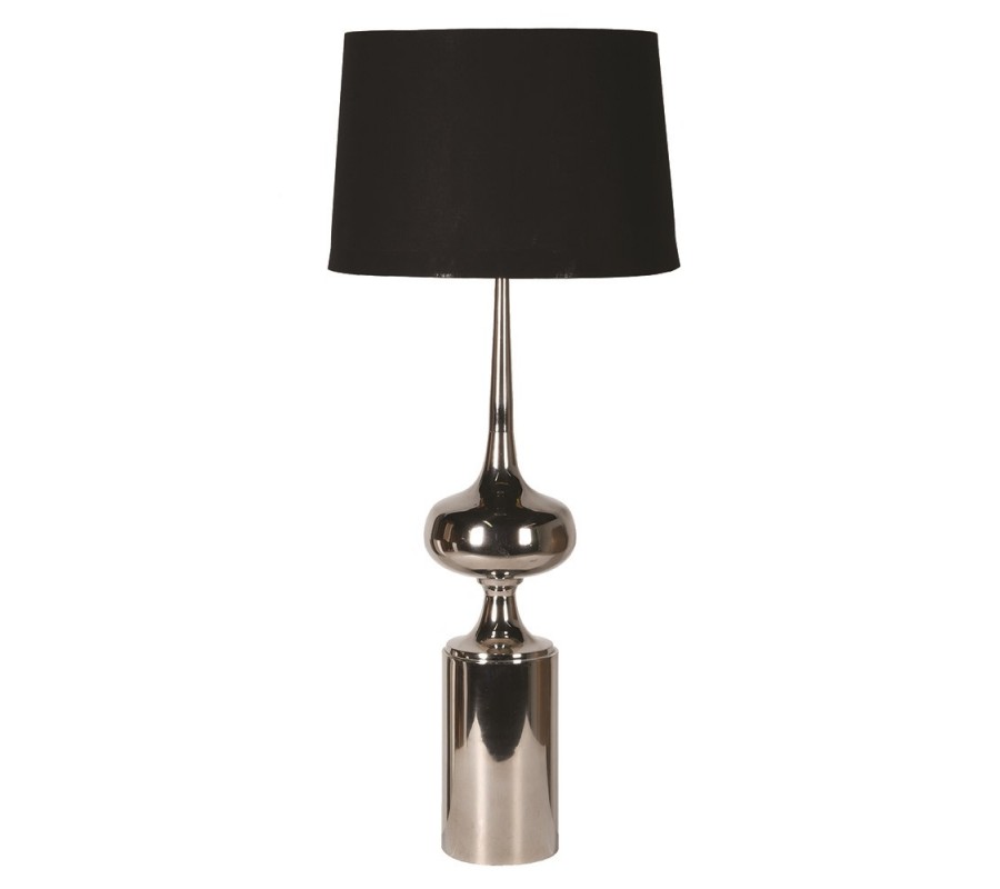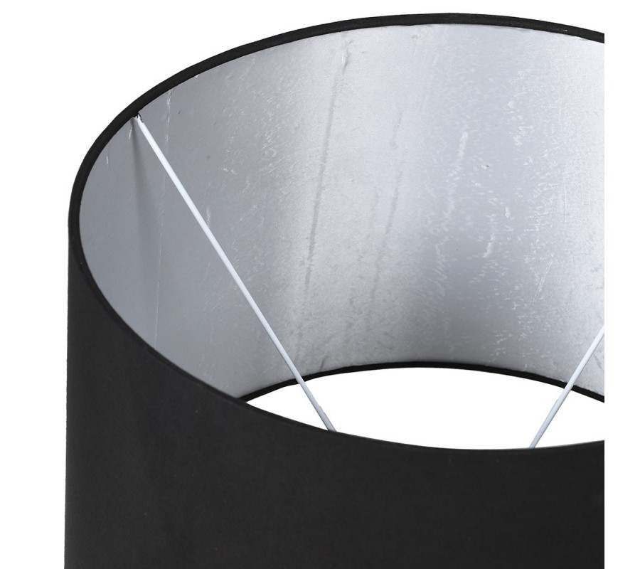Tienidlo je vyrobené z ľanu, má čiernu farbu a klasický valcový tvar s jemne širším spodným okrajom. Kontrast medzi lesklou kovovou nohou a matným povrchom čierneho tienidla vytvára harmonickú kombináciu glamour štýlu.
