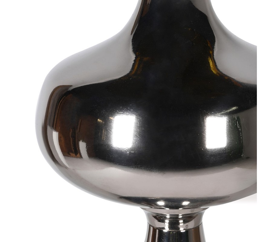 Stolná lampa Ostris má elegantnú kovovú nohu, ktorá zaujme svojim tvarovaním. Nohu tvorí cylindrický spodný segment, ktorý sa rozširuje smerom nahor do oblého stredného prvku, pripomínajúceho sploštenú guľu. Nad touto časťou sa noha postupne zužuje do štíhleho a jemne zaobleného tvaru, ktorý podčiarkuje jej sofistikovaný vzhľad. Povrch kovovej nohy je lesklý, v chrómovej farbe, čo dodáva lampe luxusný glamour nádych.