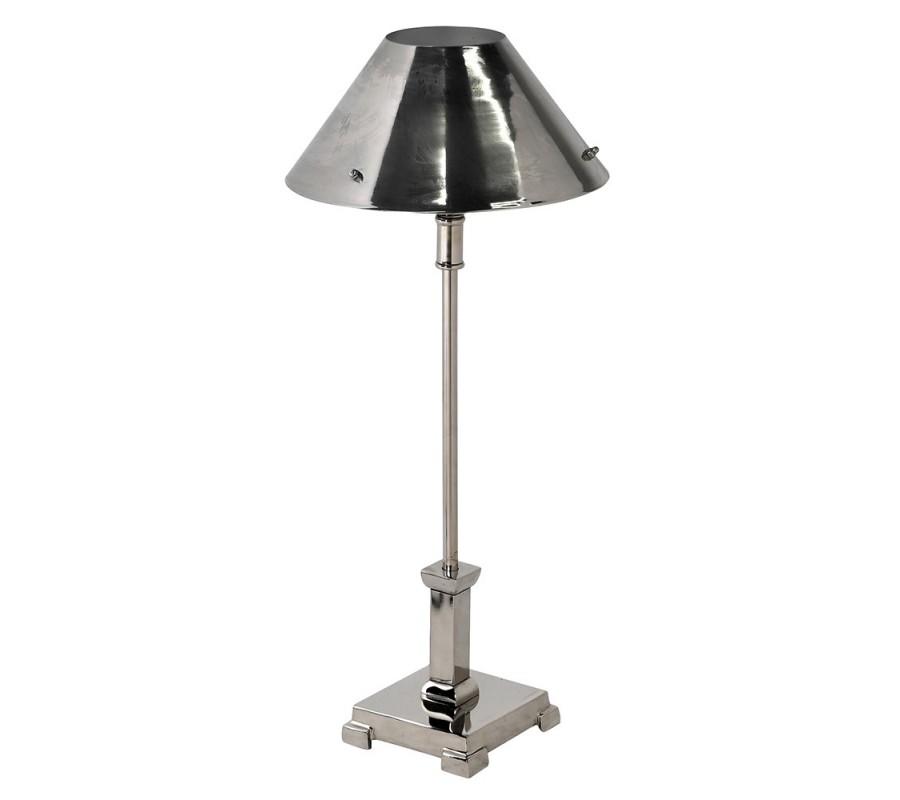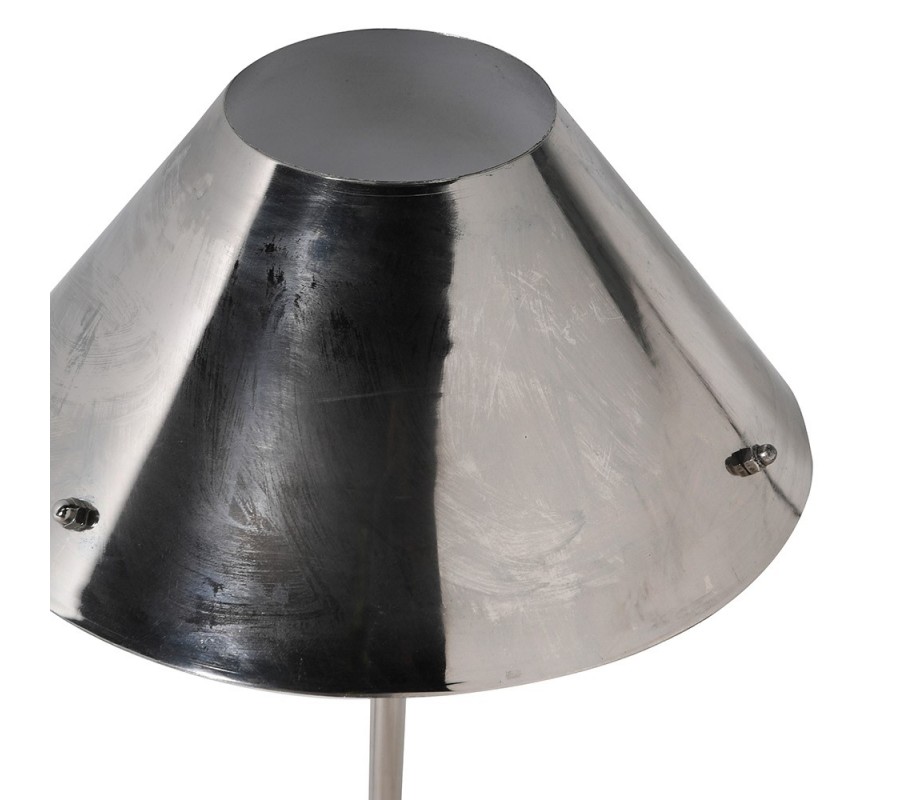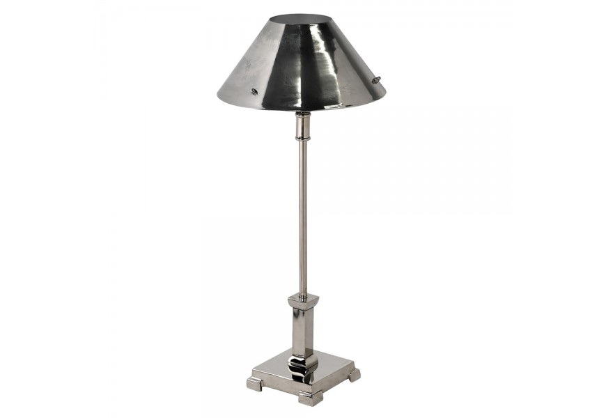 Tienidlo má kužeľový tvar, ktorý smeruje svetlo priamo nadol a vytvára kontrast medzi elegantným dizajnom a praktickou funkčnosťou. Podstava lampy je štvorcová, robustná a stabilná, čo podčiarkuje jej industriálny charakter a zabezpečuje stabilitu.