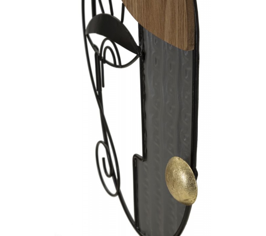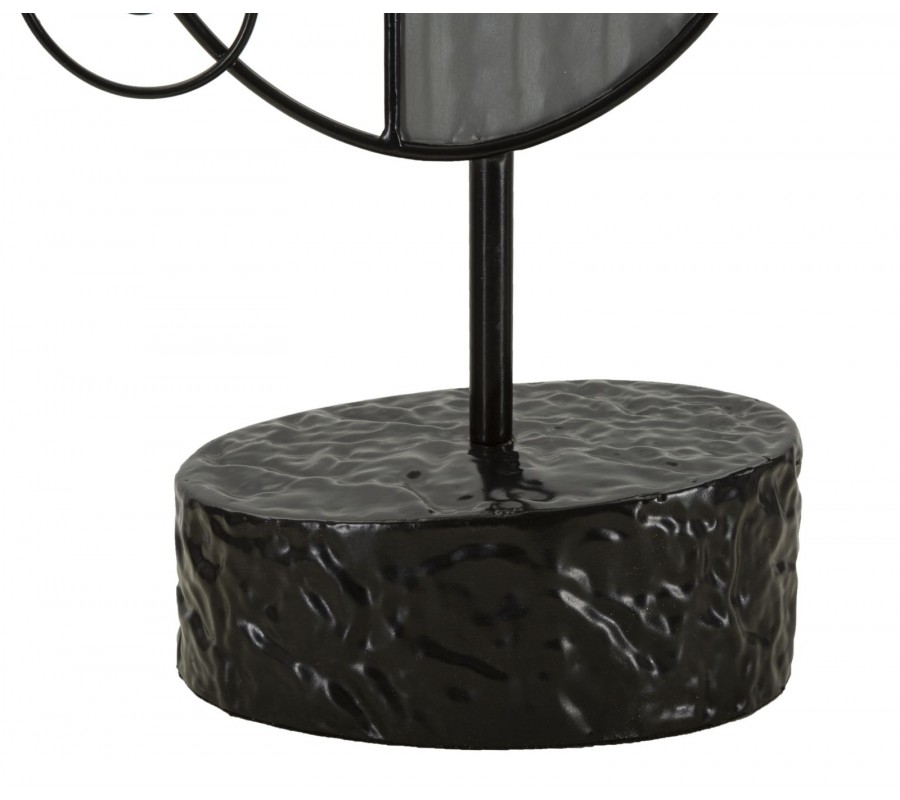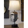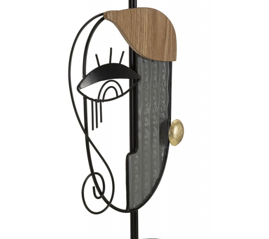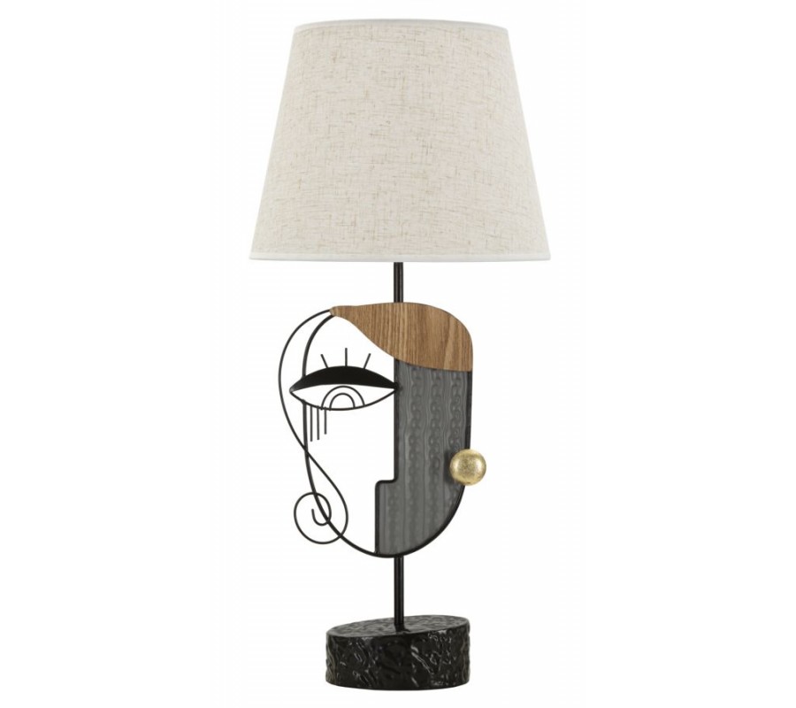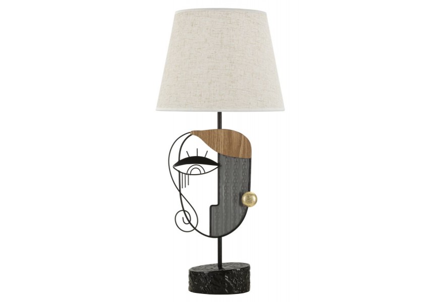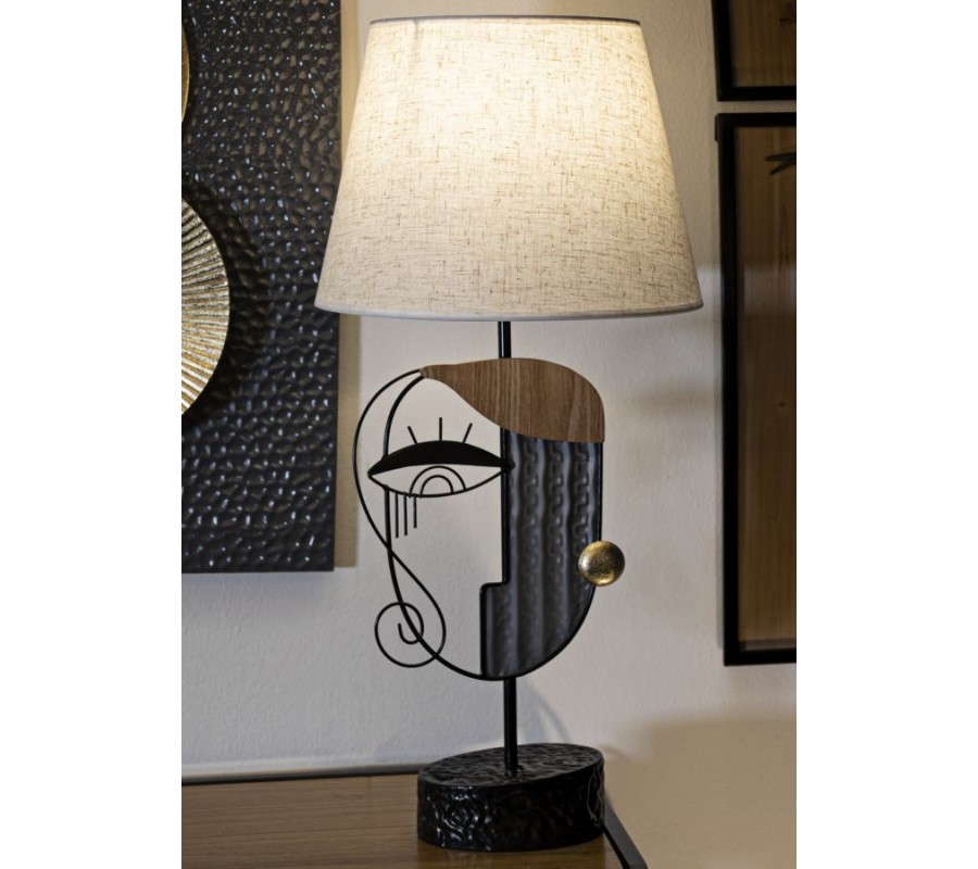 Stolná lampa Donna predstavuje jedinečné spojenie umeleckého dizajnu a funkčného osvetlenia, ktoré vynikne v každom modernom interiéri. Okrúhla čierna podstava so štruktúrovaným povrchom poskytuje stabilitu a vizuálnu hĺbku, zatiaľ čo subtílna kovová noha nesie dekoratívny reliéf ženskej tváre v abstraktnom štýle. Táto elegantná kompozícia spája čierne kovové línie, hnedé drevené prvky a sivé textúrované detaily, pričom zlaté akcenty pridávajú sofistikovaný vzhľad.