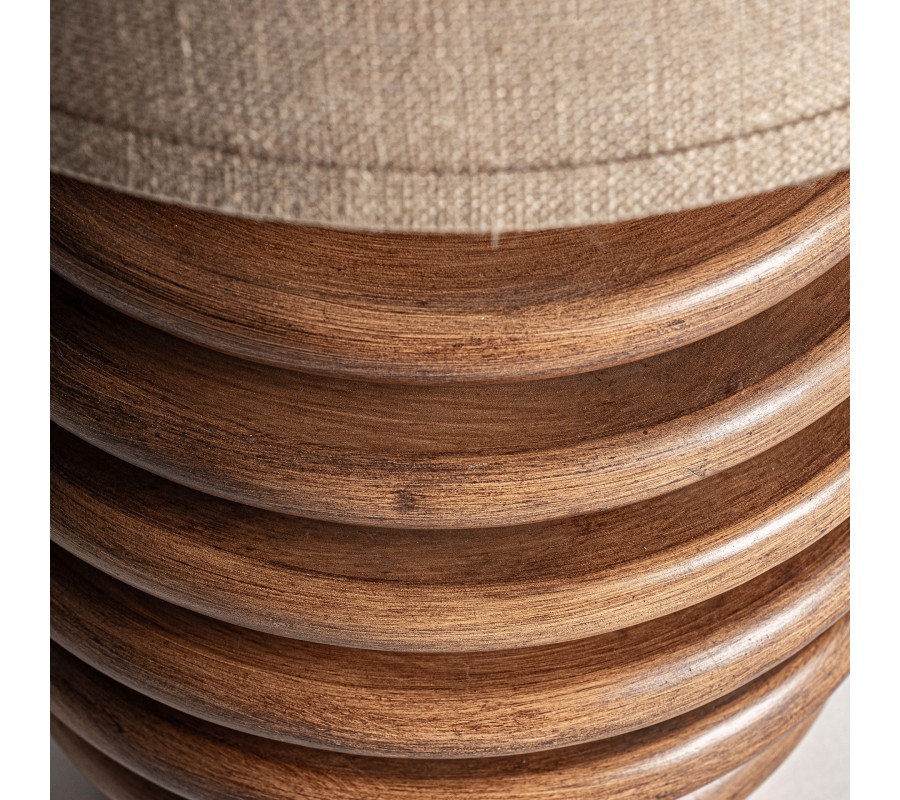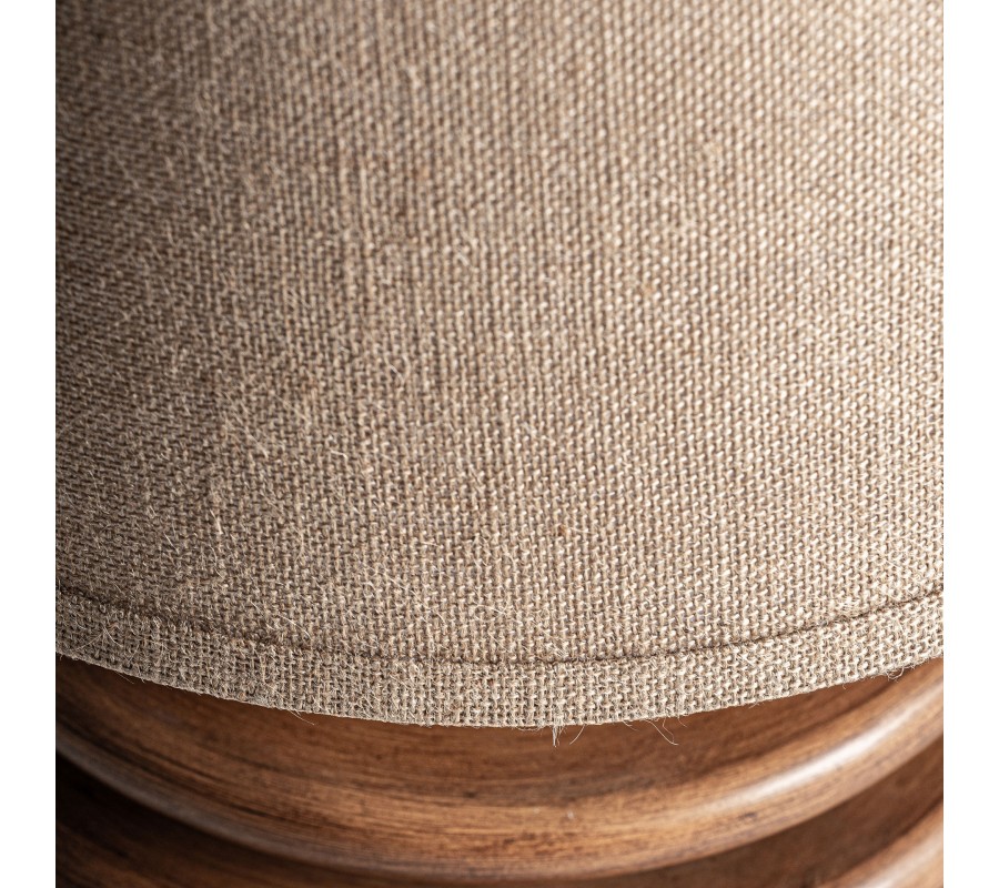Tienidlo je vyrobené z prírodného ľanu v béžovo hnedej farbe, pričom jeho jemná textúra zaisťuje príjemne rozptýlené svetlo. Kužeľový tvar tienidla dokonale ladí s tvarom nohy a zároveň prispieva k vyváženému celkovému vzhľadu.