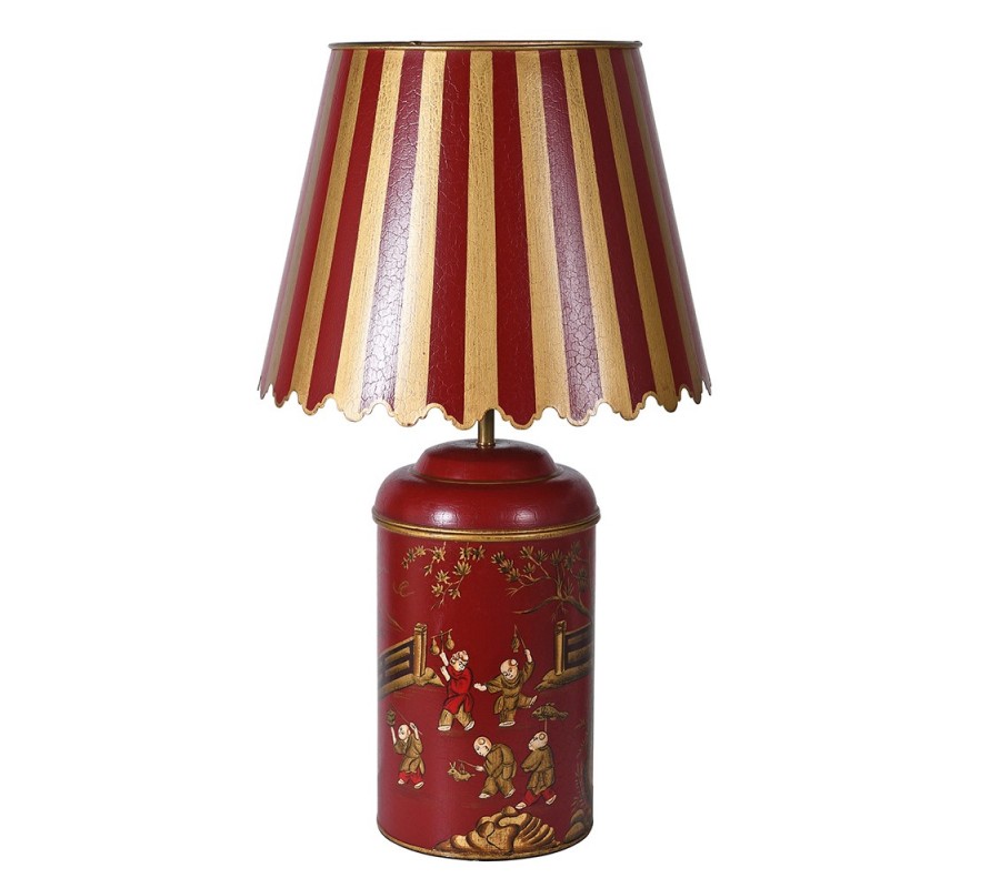 Tienidlo v tvare zrezaného kužeľa je rovnako kovové, s vertikálnymi pruhmi v červenej a zlatej farbe a dekoratívnym spodným okrajom v tvare poloblúkov, čo vytvára efekt hracej skrinky a dodáva lampe jedinečný charakter.