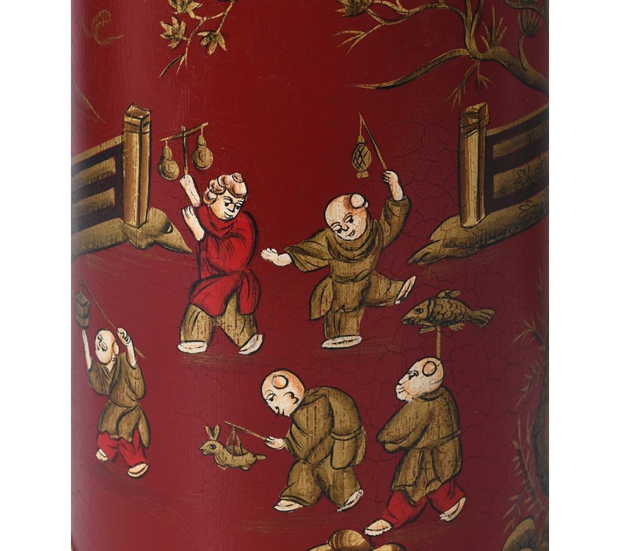 Stolná lampa Dynasty je výrazný orientálny doplnok s autentickým umeleckým spracovaním, ktorý do interiéru vnáša nádych exotiky a nostalgickej elegancie. Jej valcovitá kovová noha v sýtej červenej farbe je zdobená ručnými maľbami postavičiek a krajiny, ktoré pripomínajú motívy z tradičných ázijských miniatúr. Tento dekor je zvýraznený jemnými zlatými detailmi, ktoré pôsobia luxusne a remeselne.