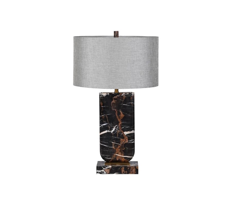 Lampa Astrida v sebe spája glamour eleganciu a art deco štýl s dôrazom na luxusné materiály a prepracované detaily. Jej obdĺžniková mramorová podstava v čiernej farbe s hnedými a bielymi žilkami pôsobí ako umelecký prvok, ktorý do interiéru prináša noblesu a nadčasový charakter. Zaoblené spodné hrany nohy zjemňujú tvar a dodávajú lampe harmonický vzhľad.