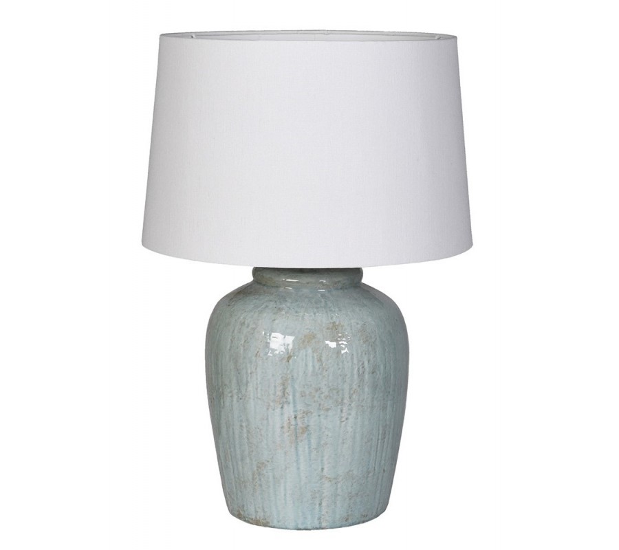 Dizajnová vintage stolná lampa Zippy so svetlou modrou keramickou podstavou s patinou a bielym tienidlom 65 cm