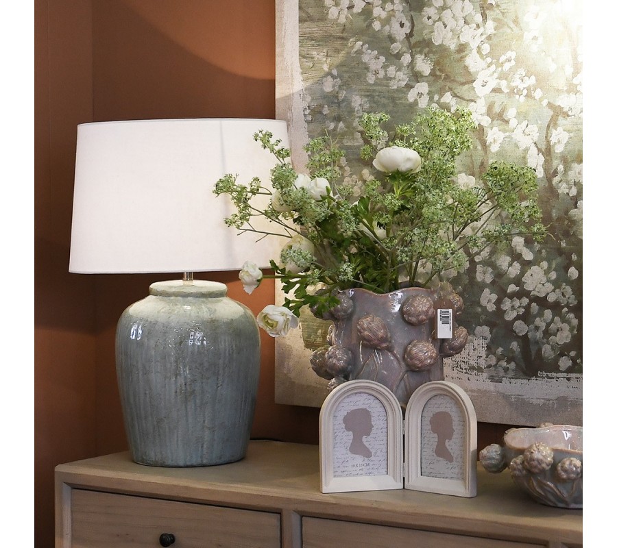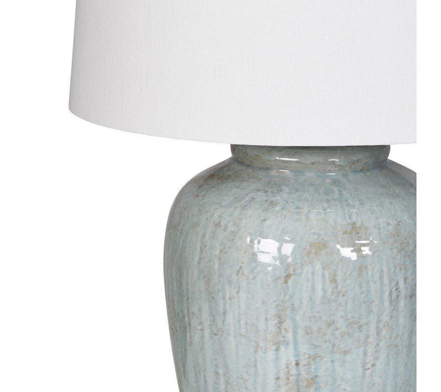 Noha lampy má okrúhly pôdorys, ktorý sa smerom nahor mierne rozširuje. Vo vrchnej časti je ukončený elegantnou krivkou a nízkym zúženým hrdlom. Svojím tvarom pripomína tradičné hlinené nádoby. Je vyrobená z keramiky a povrch zdobí náter v svetlej modrej farbe s jemnou zelenkavou patinou, ktorá mu dodáva vintage nádych. Dizajn prekrýva glazúra s vysokým leskom, ktorá pri zažatí efektne odráža svetlo.