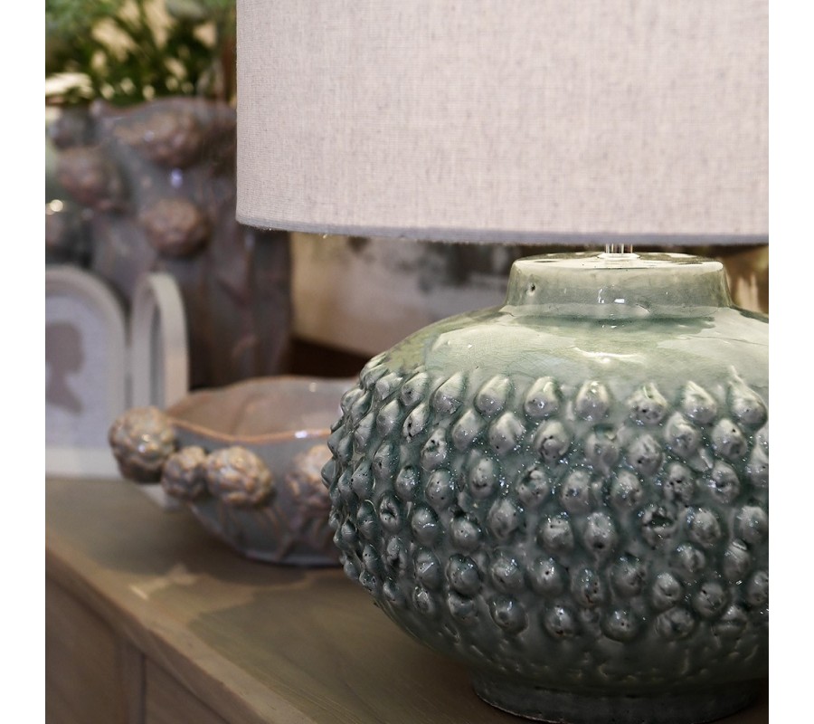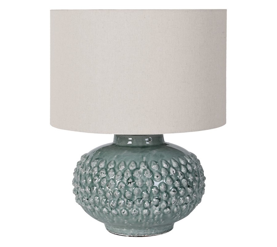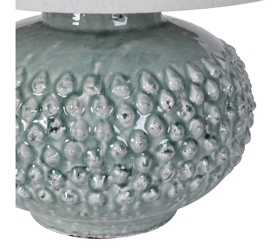 Lampa má elegantnú siluetu, s mohutnou podstavou a valcovitým tienidlom. Podstava je vyrobená z keramiky a lakovaná v elegantnom pastelovom tyrkysovomodrom odtieni. Má výrazne rozšírenú strednú časť a smerom dole sa mierne zužuje. Vo vrchnej časti prechádza do štíhleho hrdla, na ktorom je umiestnený závit na žiarovku typu E37, ktorá nie je súčasťou balenia.