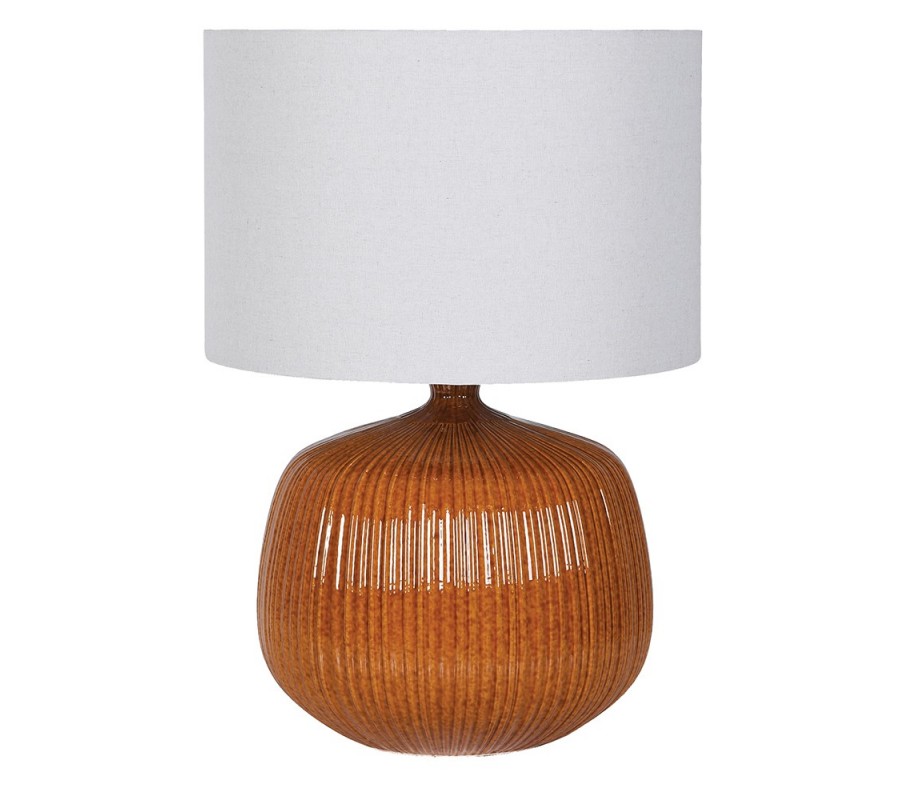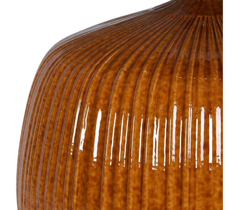 Lampa má širokú podstavu okrúhleho tvaru, ktorá prudko prechádza do úzkeho hrdla. Je vyrobená z keramiky a zdobia ju dlhé vertikálne zárezy, vytvárajúce husté rebrovanie. Lakovanie v karamelovej hnedej farbe je jemne nepravidelné a striedanie tmavších a svetlejších tónov vytvára zaujímavú štruktúru. Povrchová glazúra má vysoký lesk, ktorý v kombinácii s drážkovaným dizajnom vytvára bohaté odlesky svetla.