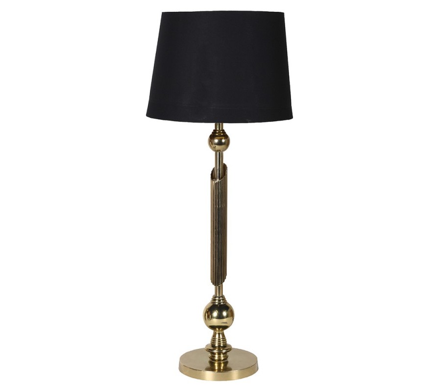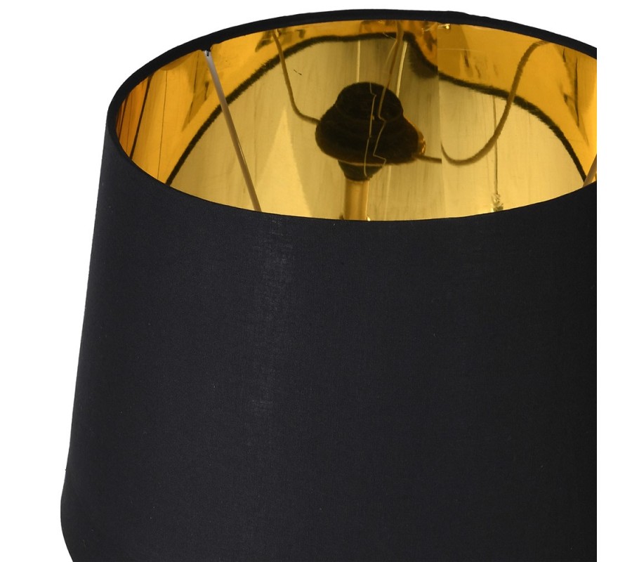 Vysoká stolná lampa Kelly predstavuje elegantný doplnok v glamour a vintage štýle, ktorý spája lesk zlata s noblesou čiernej farby. Jej kovová zlatá noha je tvorená dekoratívnymi guľami umiestnenými pri podstave a pod tienidlom, medzi ktorými sa nachádza vertikálny valcovitý prvok s jemnými drážkami, dodávajúci lampe klasický, no zároveň luxusný vzhľad.