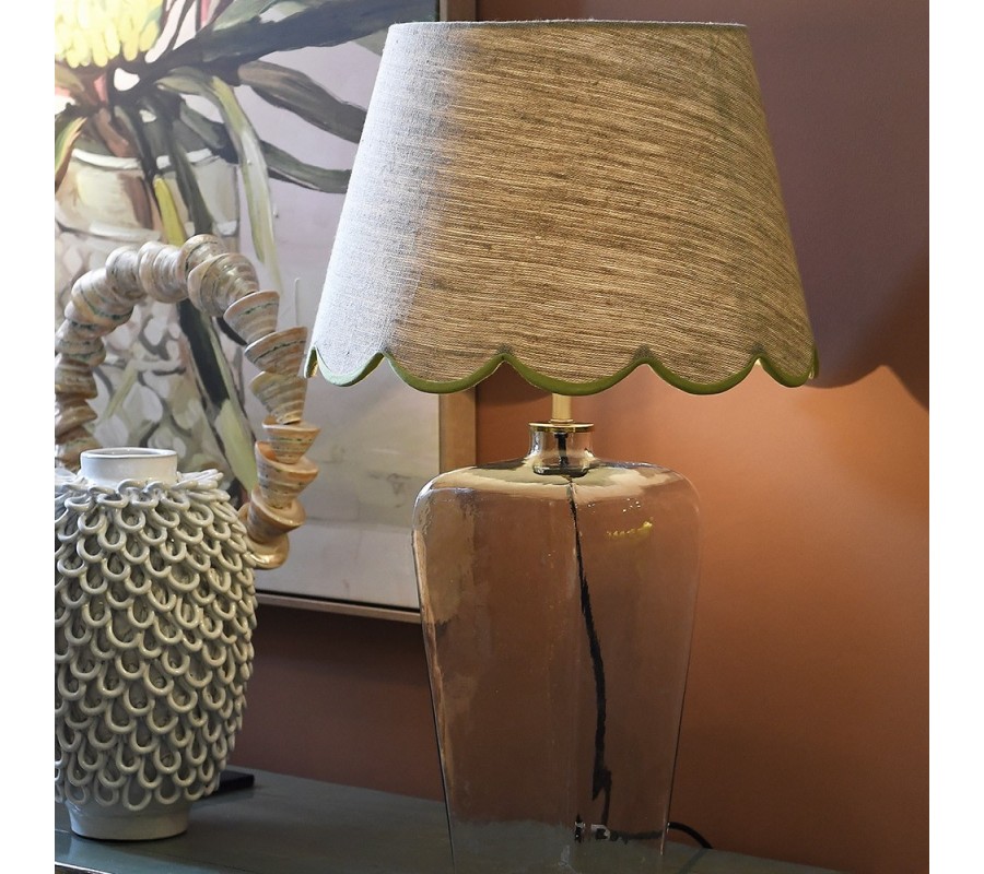 Jemná a štýlová stolná lampa Bella Verde vyniká svojím elegantným dizajnom s nádychom prírodnej sviežosti. Kombinuje hranatú, priehľadnú sklenenú nohu s viditeľným vnútorným káblom, ktorý pôsobí moderne a odľahčuje celkový vzhľad. Sklenená podstava má úzky, mierne zúžený tvar, vďaka čomu pôsobí subtílne a elegantne. Dopĺňa ju ľahké béžové tienidlo z ľanu, ktorého spodný okraj je vlnkovito vykrojený a lemovaný jemnou zelenou stuhou. Tento detail dodáva lampe originálny, hravý a svieži vzhľad, ktorý zjemňuje celkový dojem a pôsobí prirodzene a harmonicky.