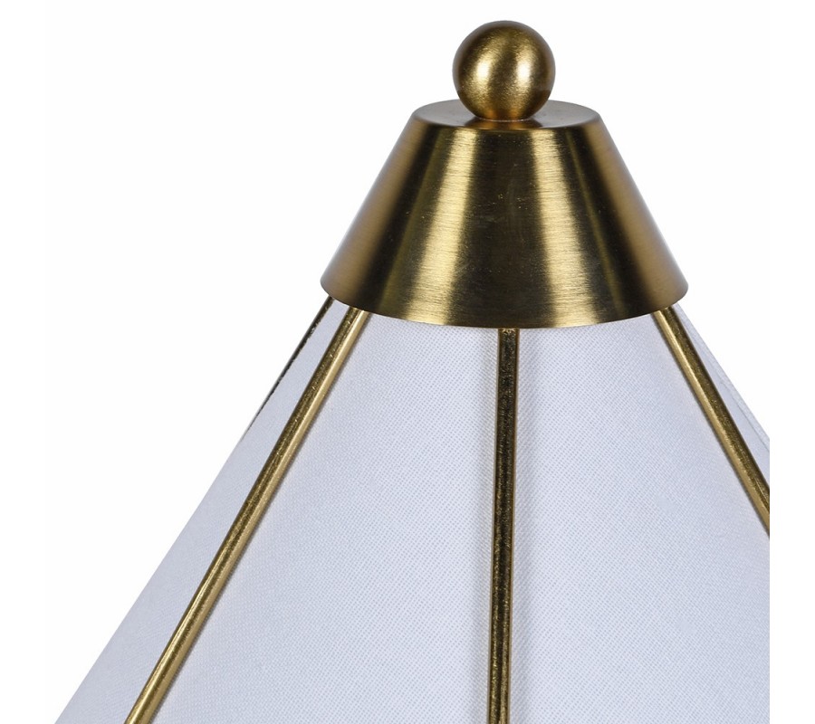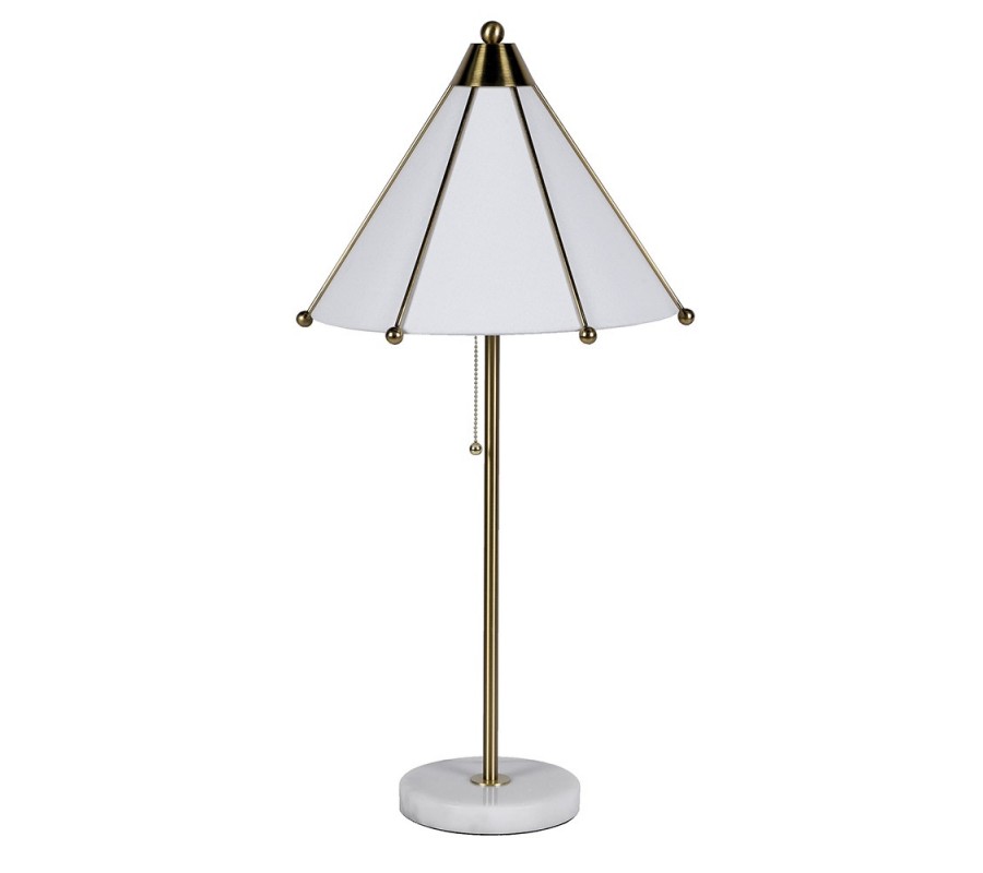 Dizajnová stolná lampa Umbrella zaujme svojím originálnym tvarom pripomínajúcim dáždnik a spája vintage eleganciu s moderným prevedením. Kužeľové tienidlo s bielym povrchom dopĺňa zlatá kovová konštrukcia s ozdobnými zakončeniami a decentným leskom. Zlatá stredová tyč kontrastuje s okrúhlou bielou podstavou z mramoru, ktorá lampe dodáva stabilitu aj luxusný vzhľad. Zapínanie je riešené praktickou retiazkou zo zlatých kovových guličiek, ktorá dotvára celkový retro dojem.