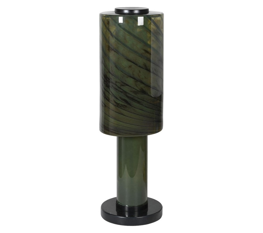 Moderná sklenená stolná lampa Spiral v tmavozelenej farbe s okrúhlou kovovou podstavou 69 cm