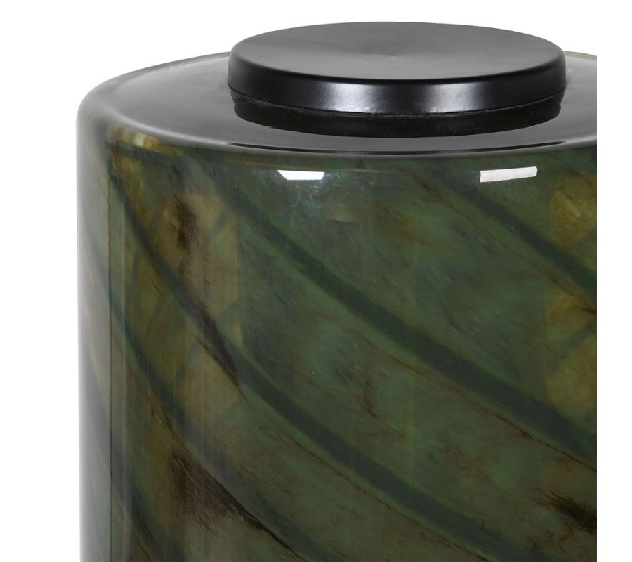Moderná sklenená stolná lampa Spiral v elegantnej tmavozelenej farbe zaujme minimalistickým, no výrazným dizajnom. Valcové tienidlo z tónovaného skla zdobia jemné špirálové línie pripomínajúce kresbu mramoru, ktoré pri rozsvietení vytvárajú zaujímavý svetelný efekt. Sklenená noha v rovnakom odtieni ladne nadväzuje na tienidlo, čím pôsobí lampa ako jednotný, harmonický celok. Stabilitu a kontrast zabezpečuje okrúhla kovová podstava v čiernej farbe, ktorá zvýrazňuje hĺbku tmavozeleného skla.